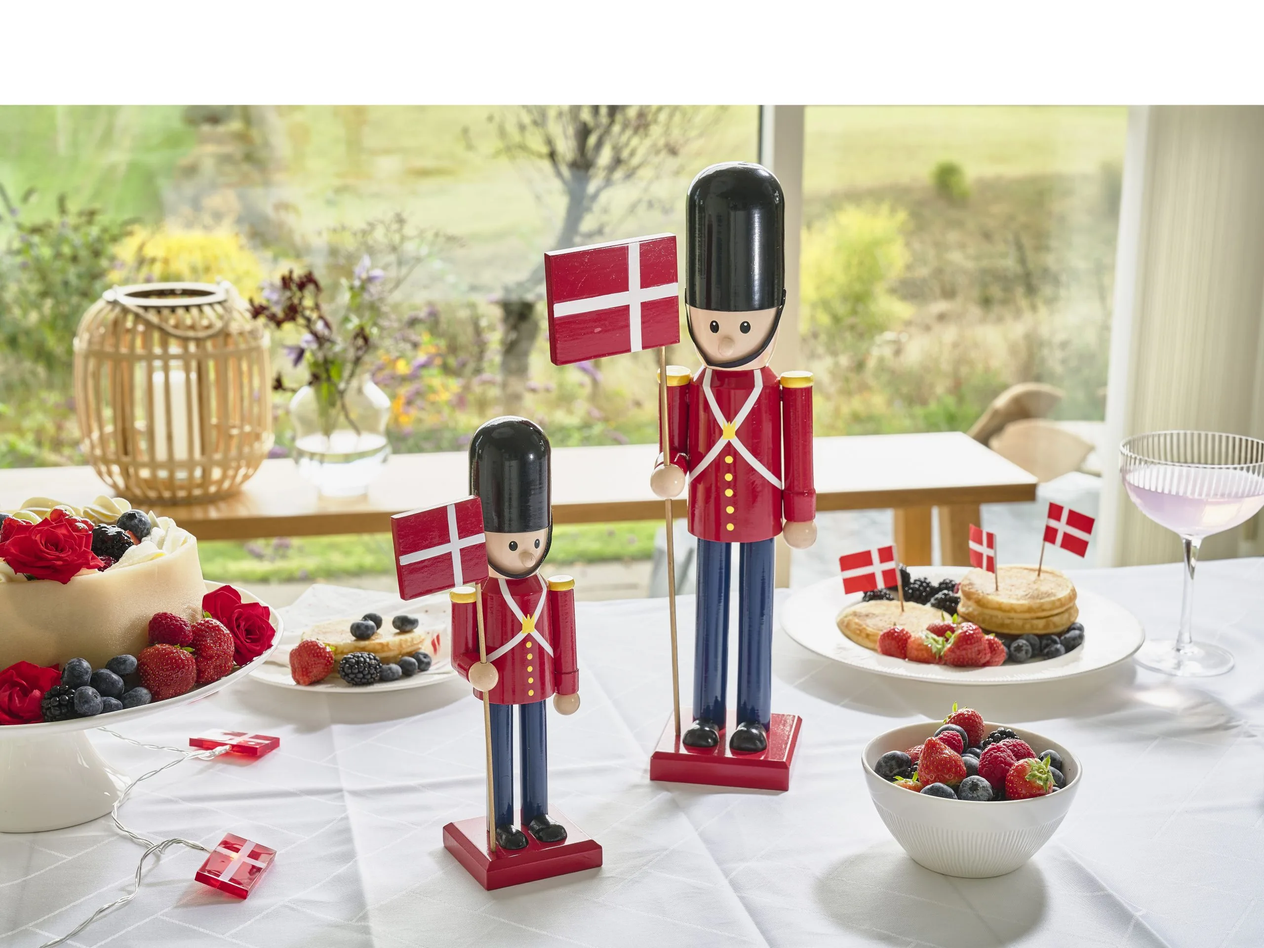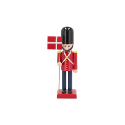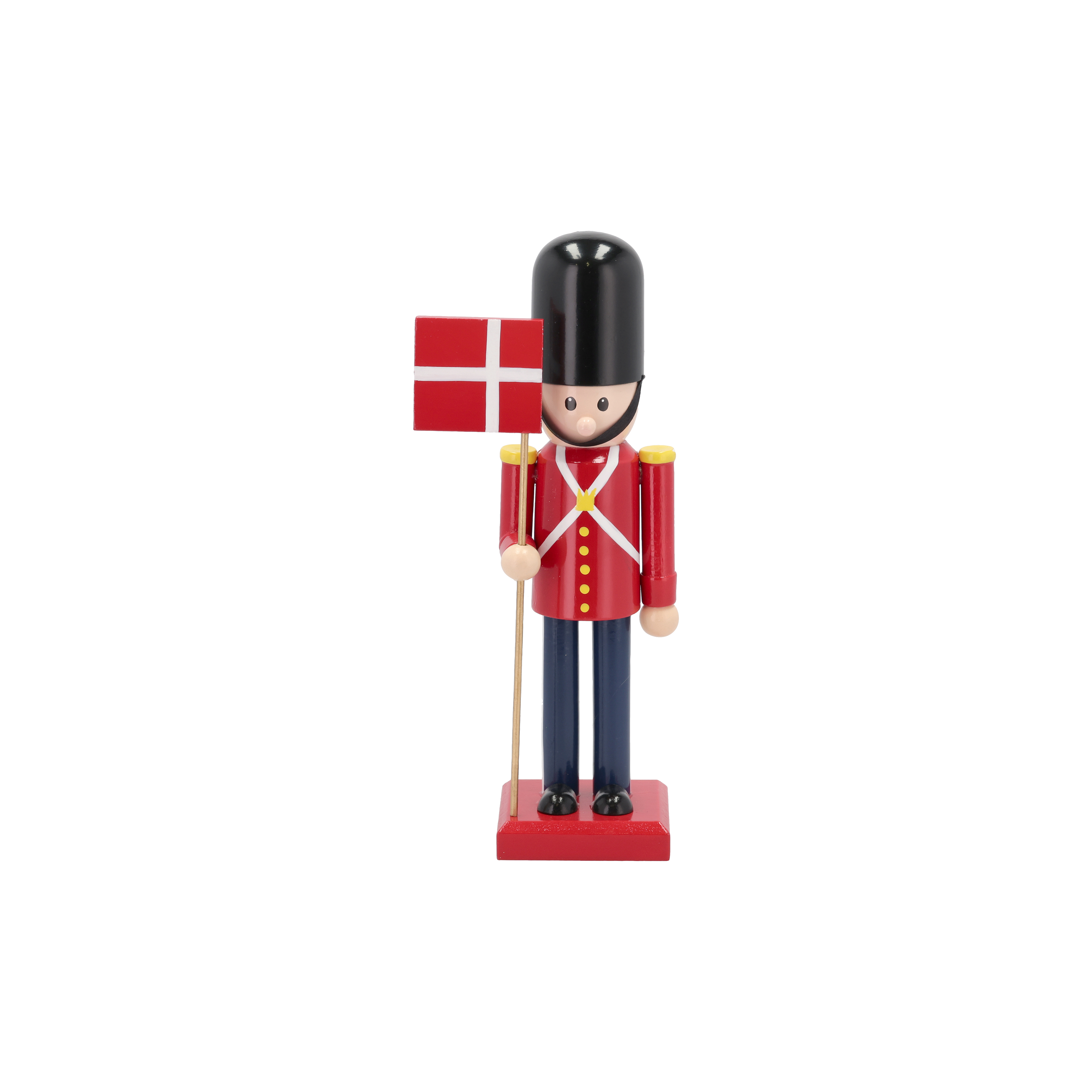 Den stolte garder står vagt med flaget og er klar til at sætte gang i festen. Med sin flotte røde frakke, høje sorte hat og blafrende flag er han et festligt indslag i hjemmet på den store dag. Garderen er 25 cm høj og produceret i træ.