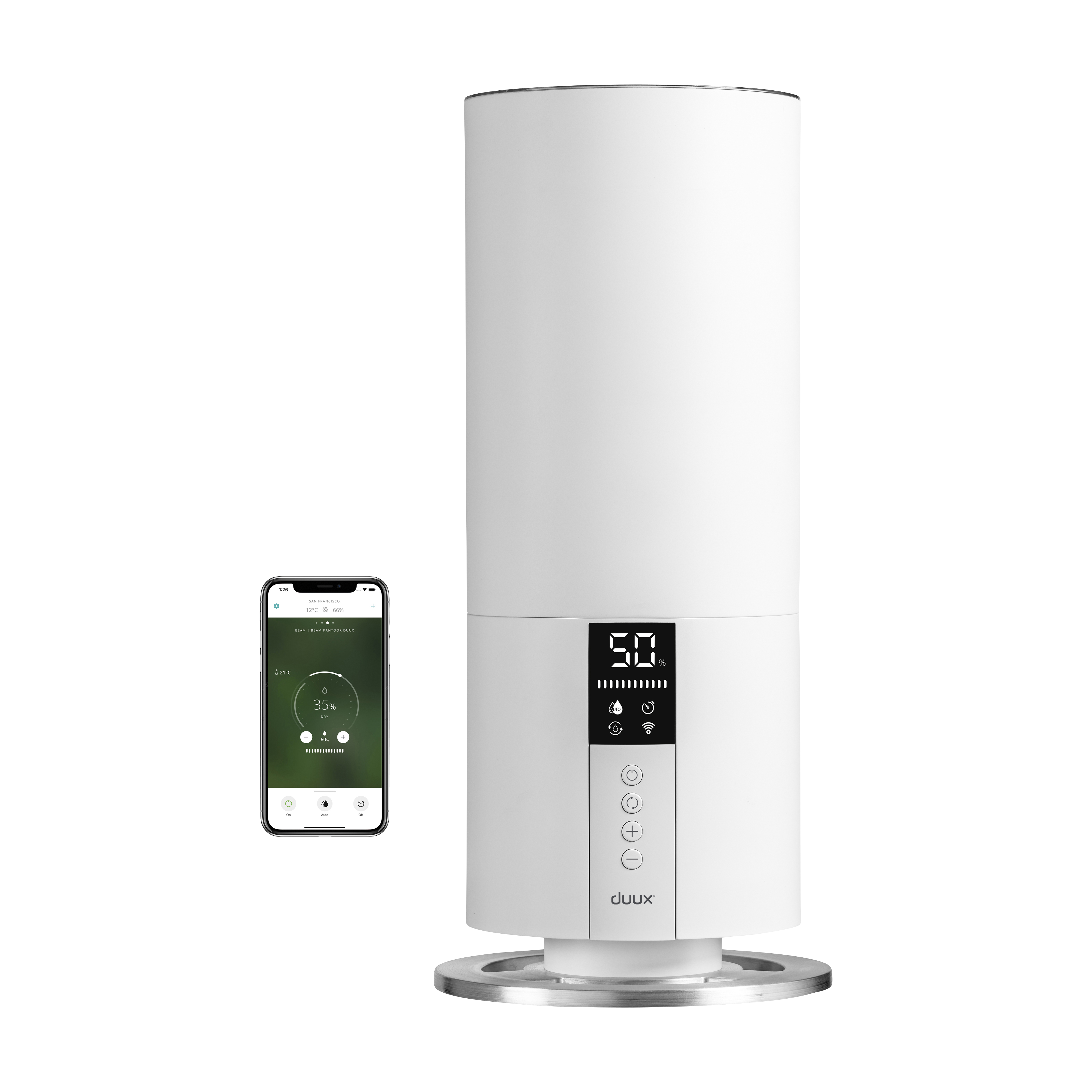 Beam har 3 outputniveauer og en selvregulerende hygrostat, der automatisk justerer output baseret på dine foretrukne indstillinger. Den har en automatisk nedlukningstimer og registrerer vandstand, fugtighed og temperatur, så du er altid opdateret.