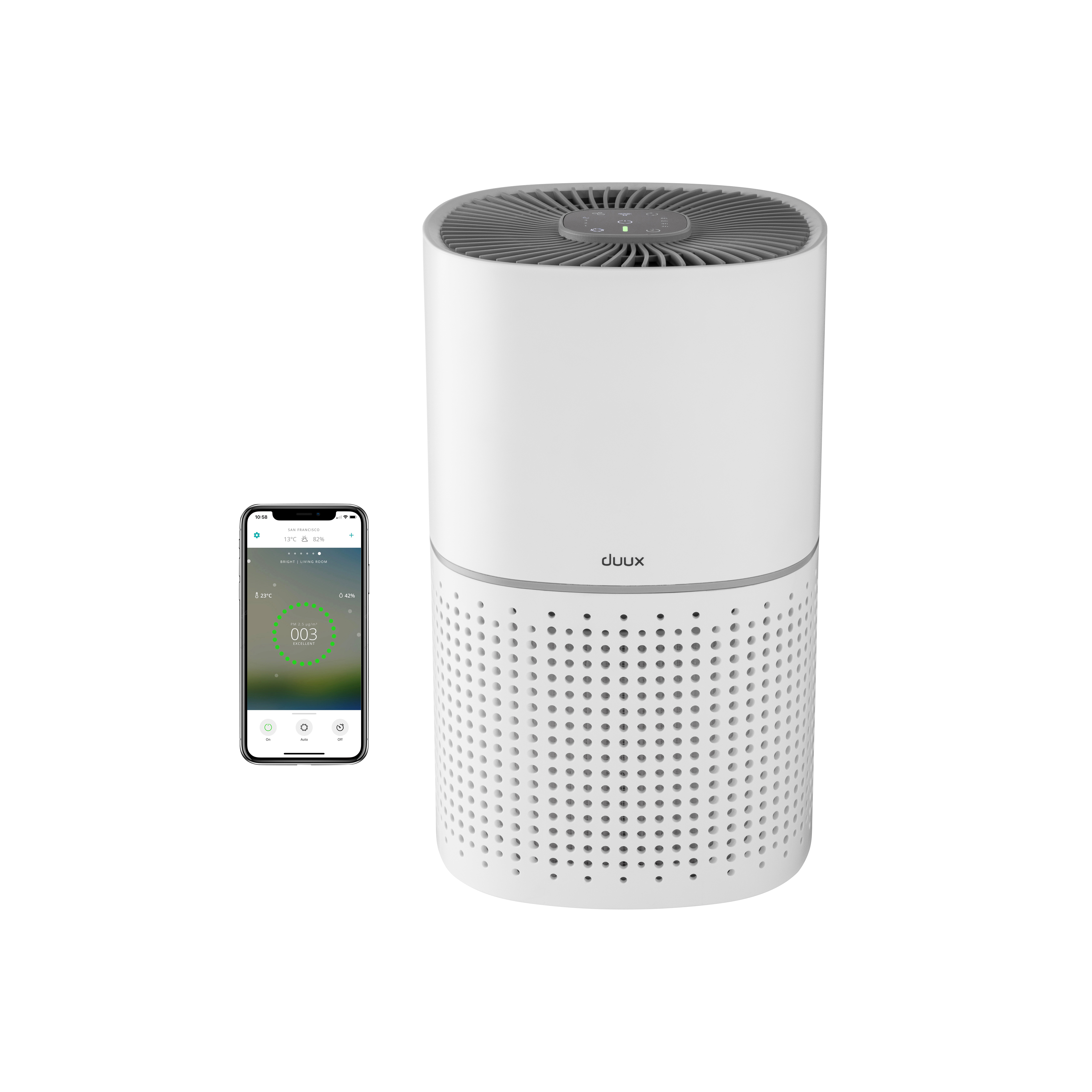 Minimalistisk design med mat overflade, der diskret kan placeres i hjemmet uden at tiltrække for meget opmærksomhed. Indbygget WIFI som du kan forbinde til dit netværk, hvis du ønsker at styre luftrenseren via den gratis Duux Smart App. Smart stemmestyring med Google Assistant og Alexa.