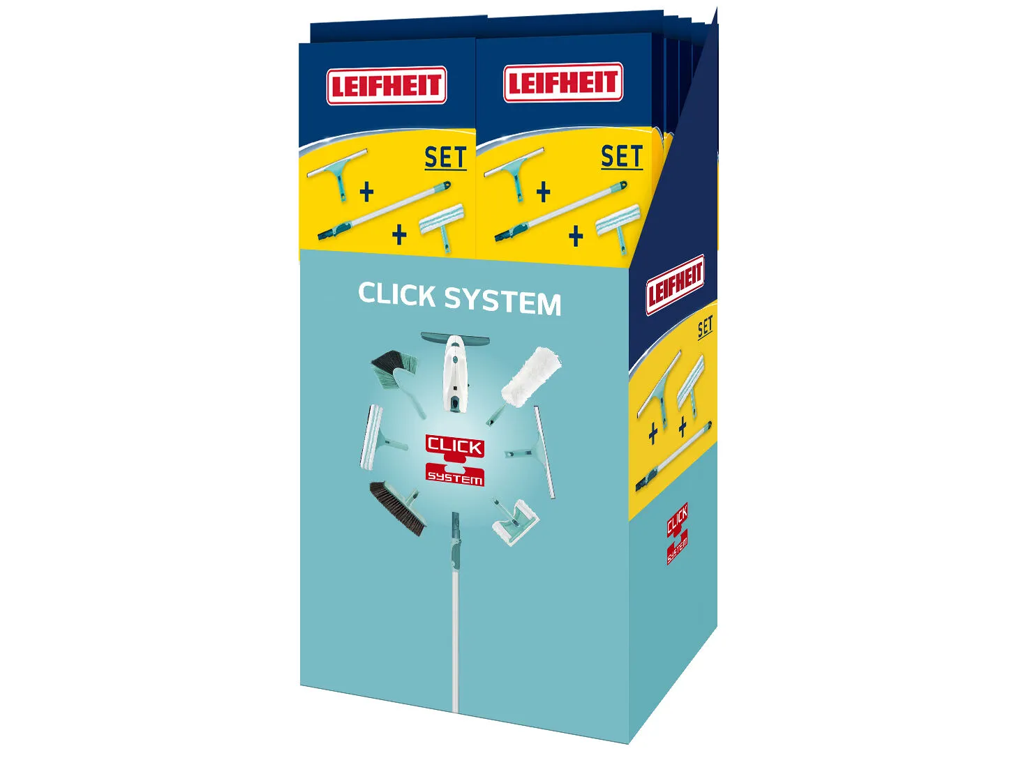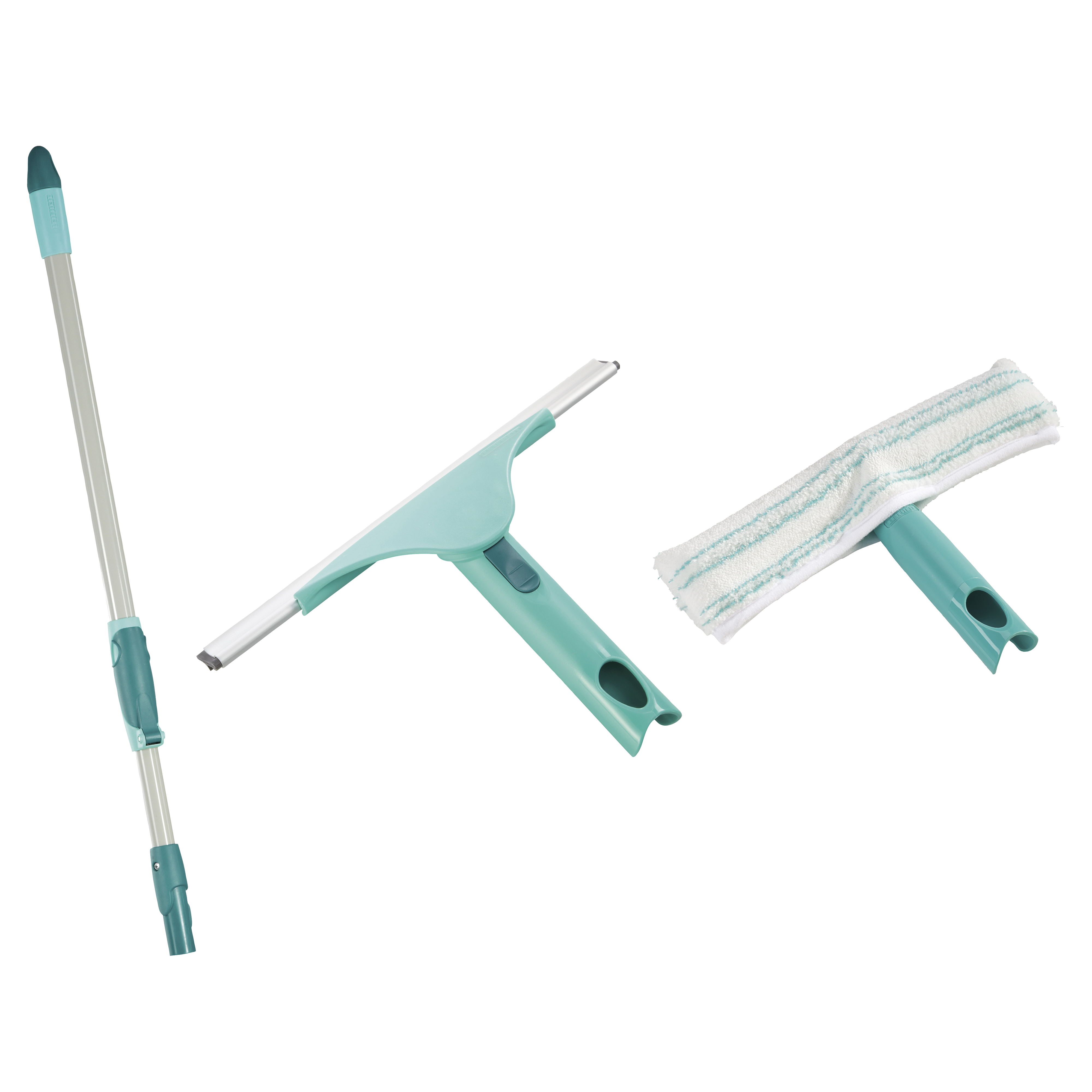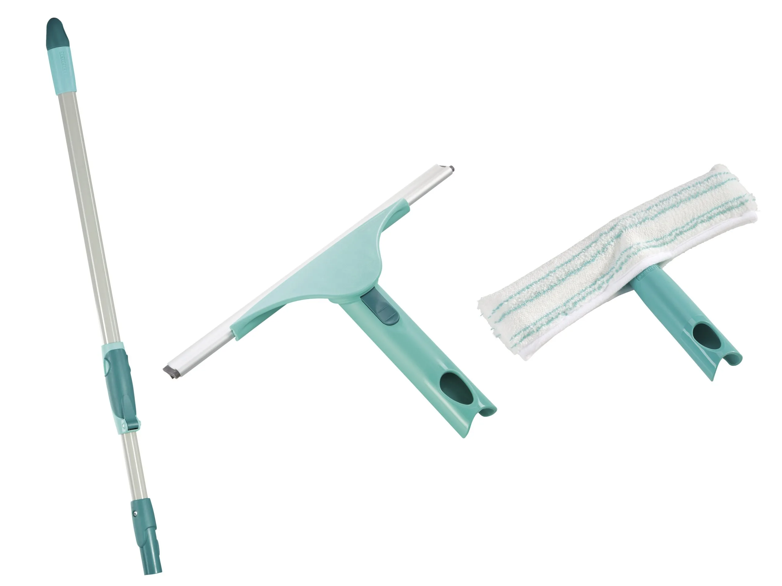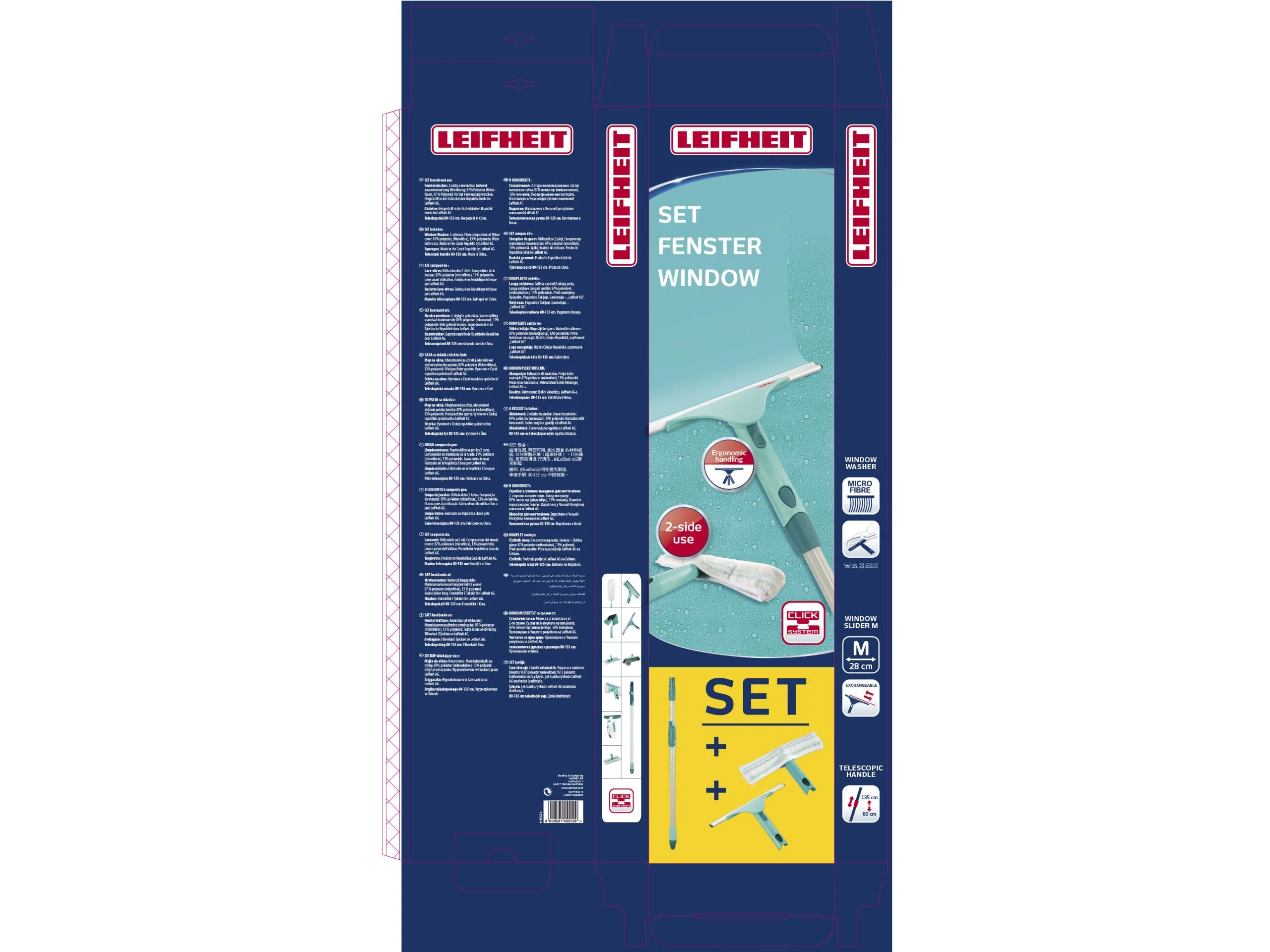 Rengøringssættet til vinduer er en del af Leifheits Click-System og indeholder 257037 Teleskopstang 75-135 cm, 258794 Skraber, der har bevægeligt led med låsemekanisme på håndtaget. Hovedet kan drejes ca. 90 grader til hver side. Bredde 28 cm, samt 258884 Vinduesvasker 26 cm med aftageligt cover.