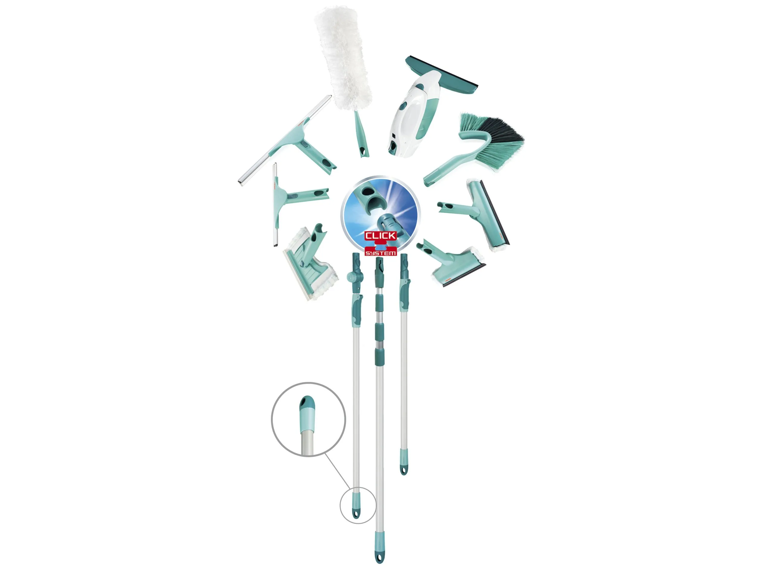 – Er en integreret del af Click systemet fra Leifheit, hvor man kan tilkøbe andre redskaber, som alle passer på den samme stang. Det gør det både smartere og billigere i længden. I denne pakke er både vinduesvasker og stang inkluderet.