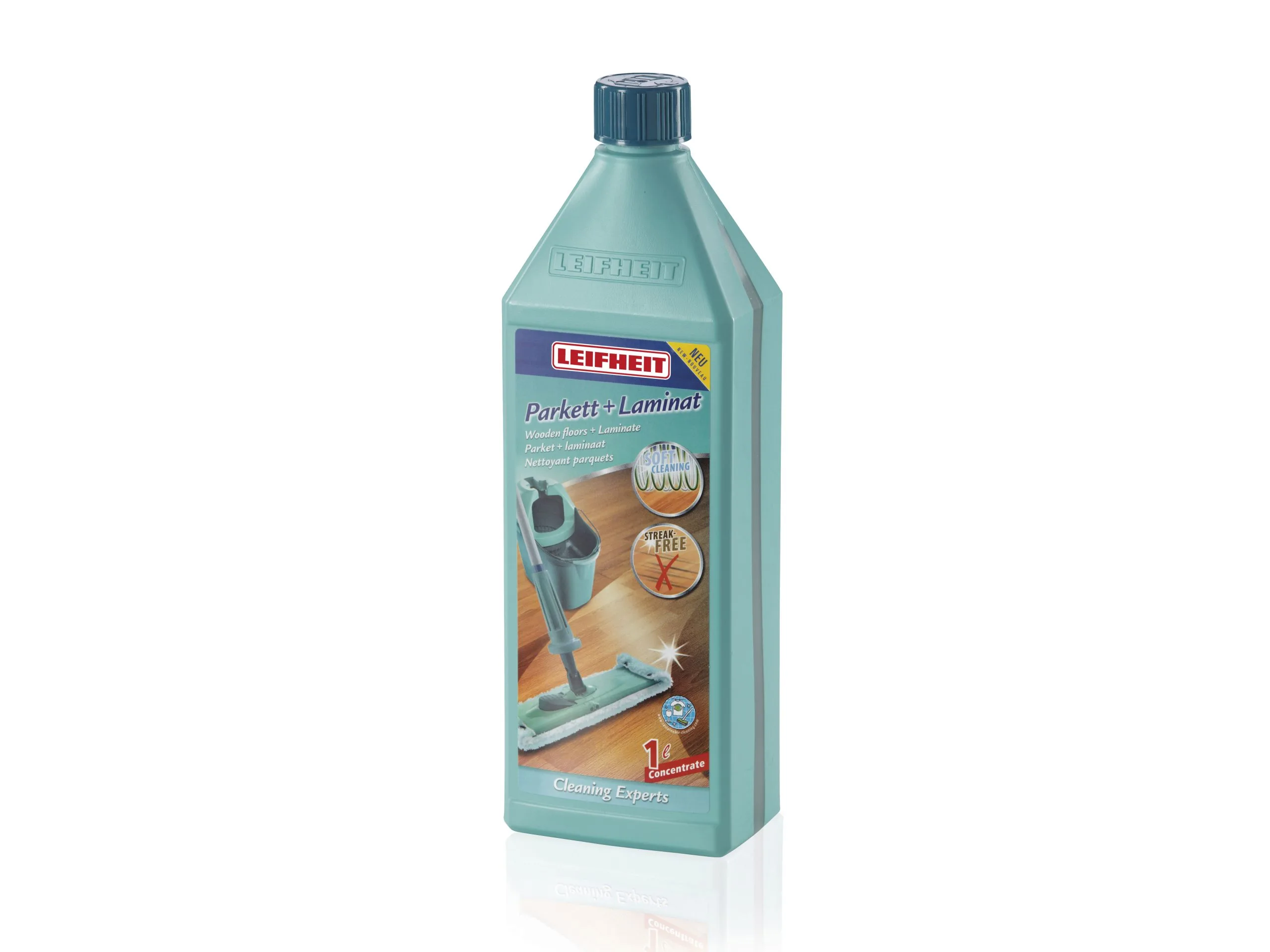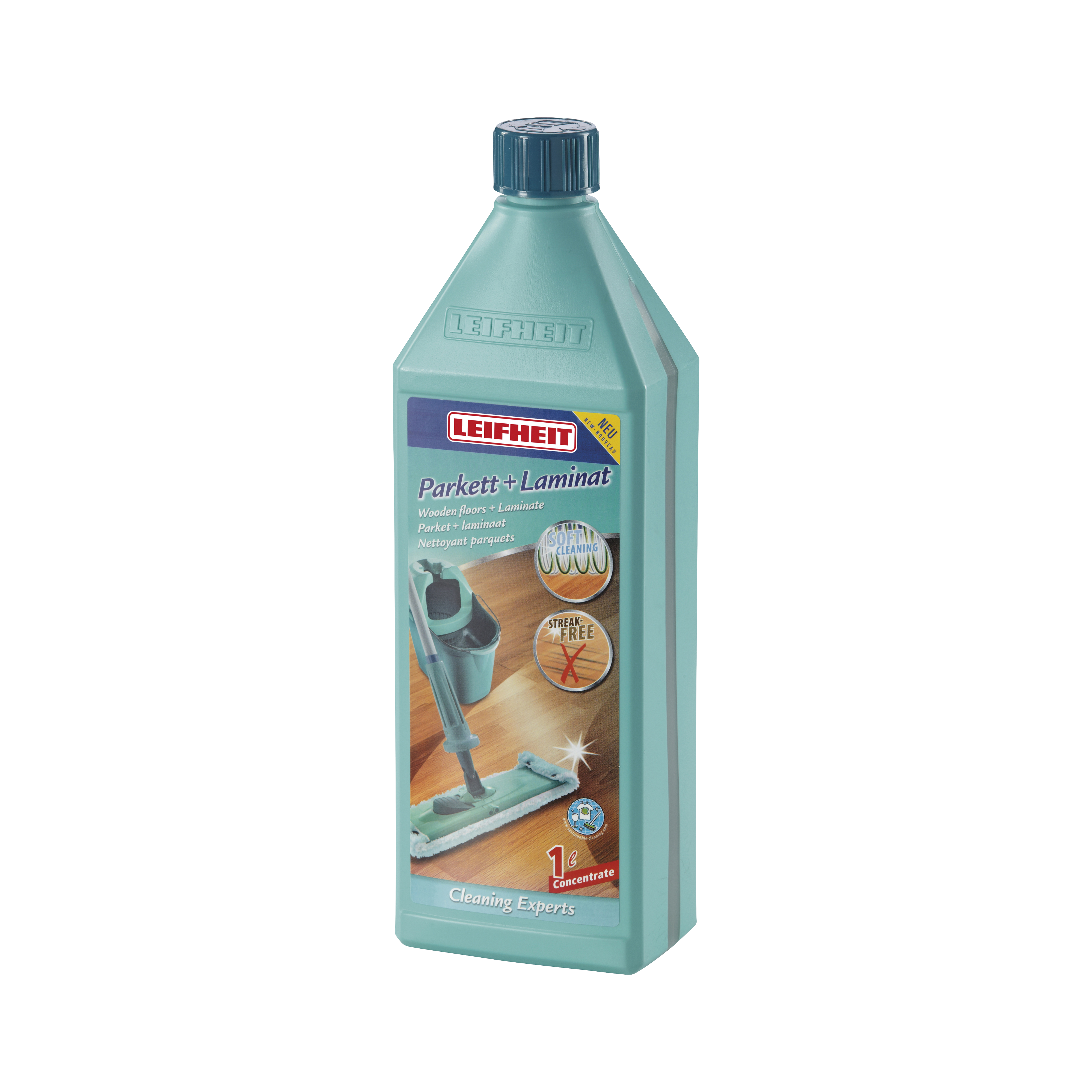 1 liter rengøringskoncentrat med sikkerhedslåg. Til rengøring af parket- og laminatgulve. Efterlader ingen striber.