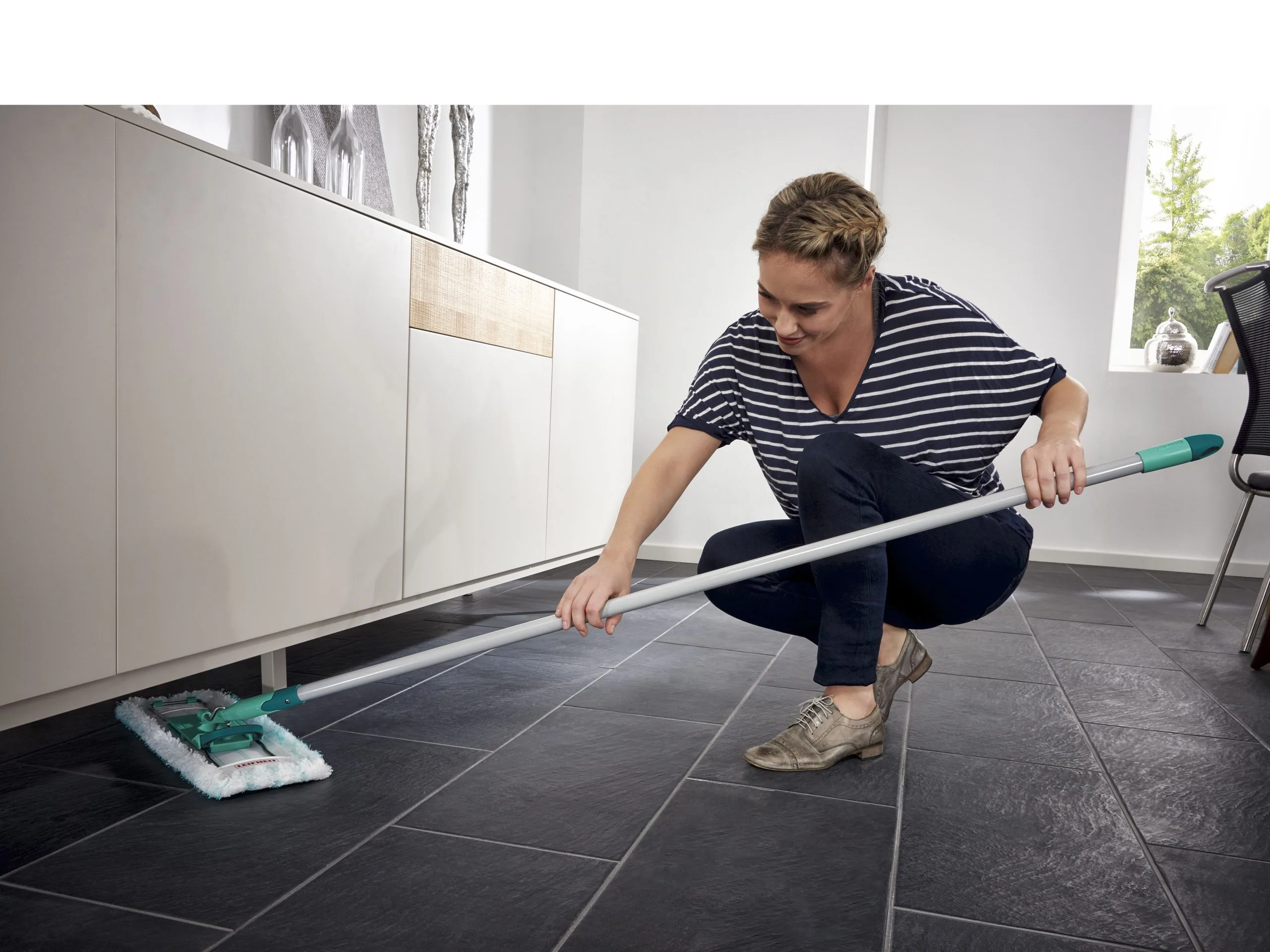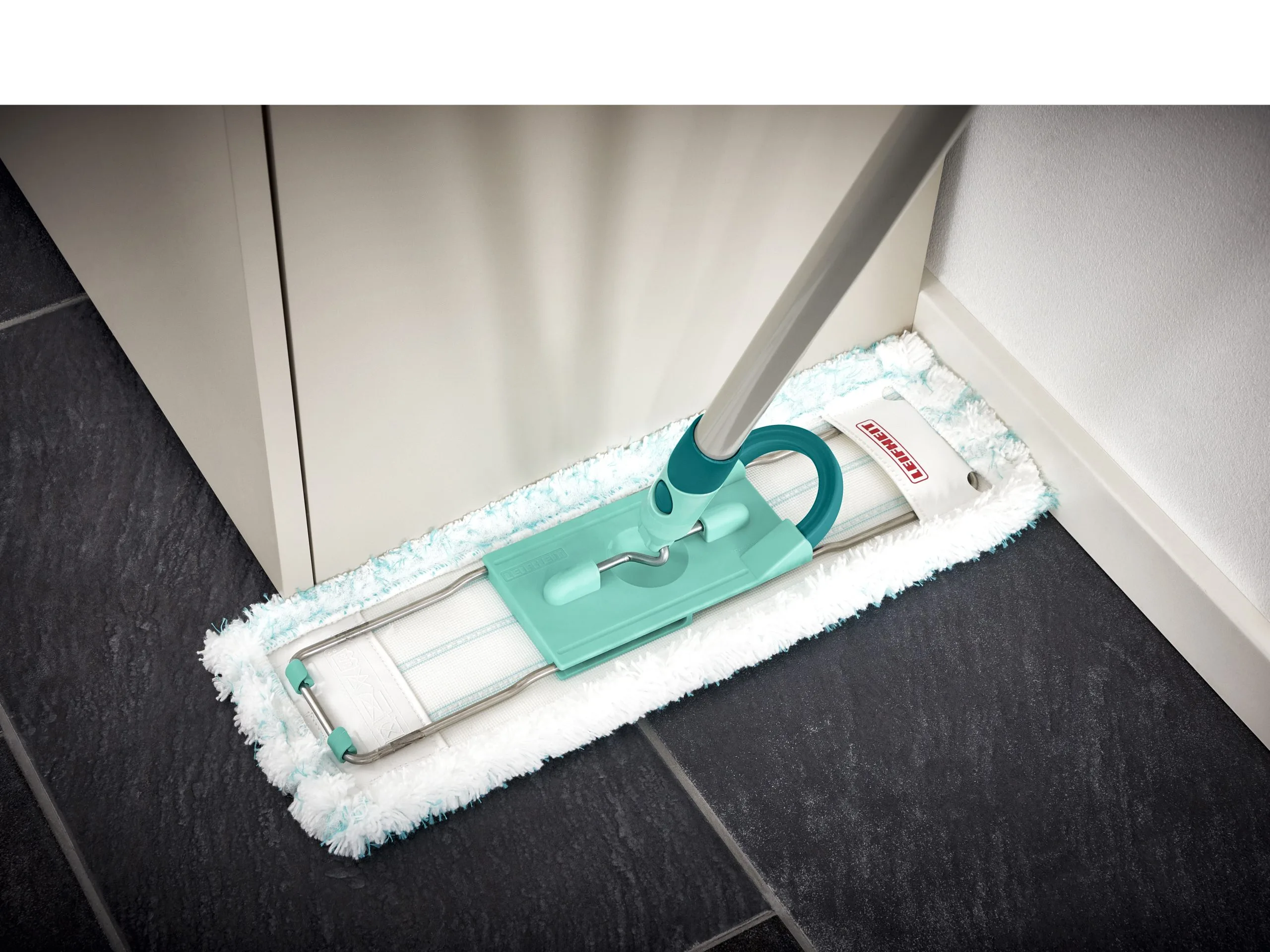 Med det fleksible 360 ° drejeled kan du effektivt føre gulvmoppen rundt i bløde sving og komme ubesværet omkring bord- og skabsben og under møbler og senge. Dobbeltfiber-kluden når de mindste fordybninger og fjerner selv genstridigt snavs grundigt.