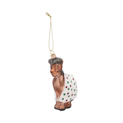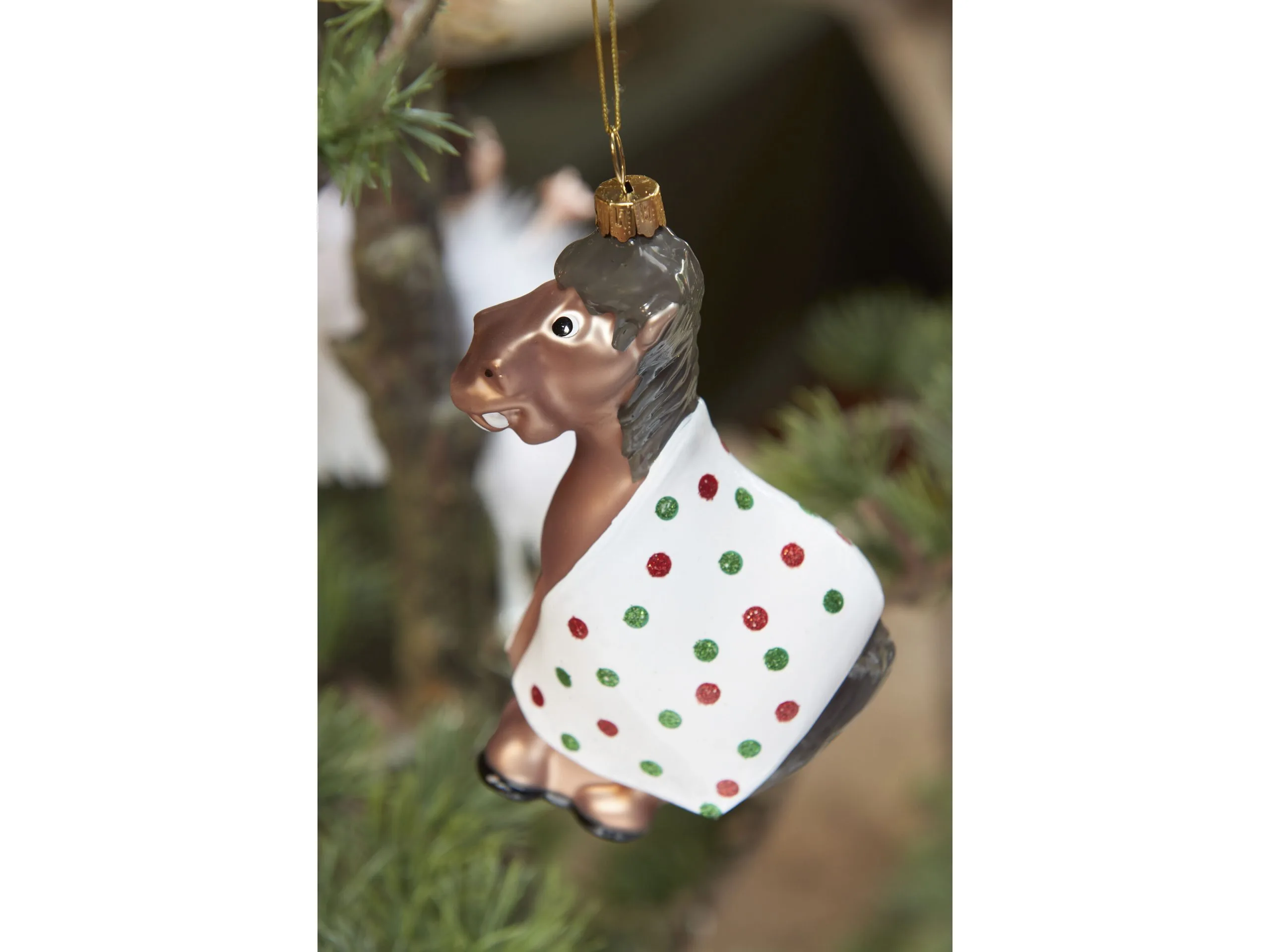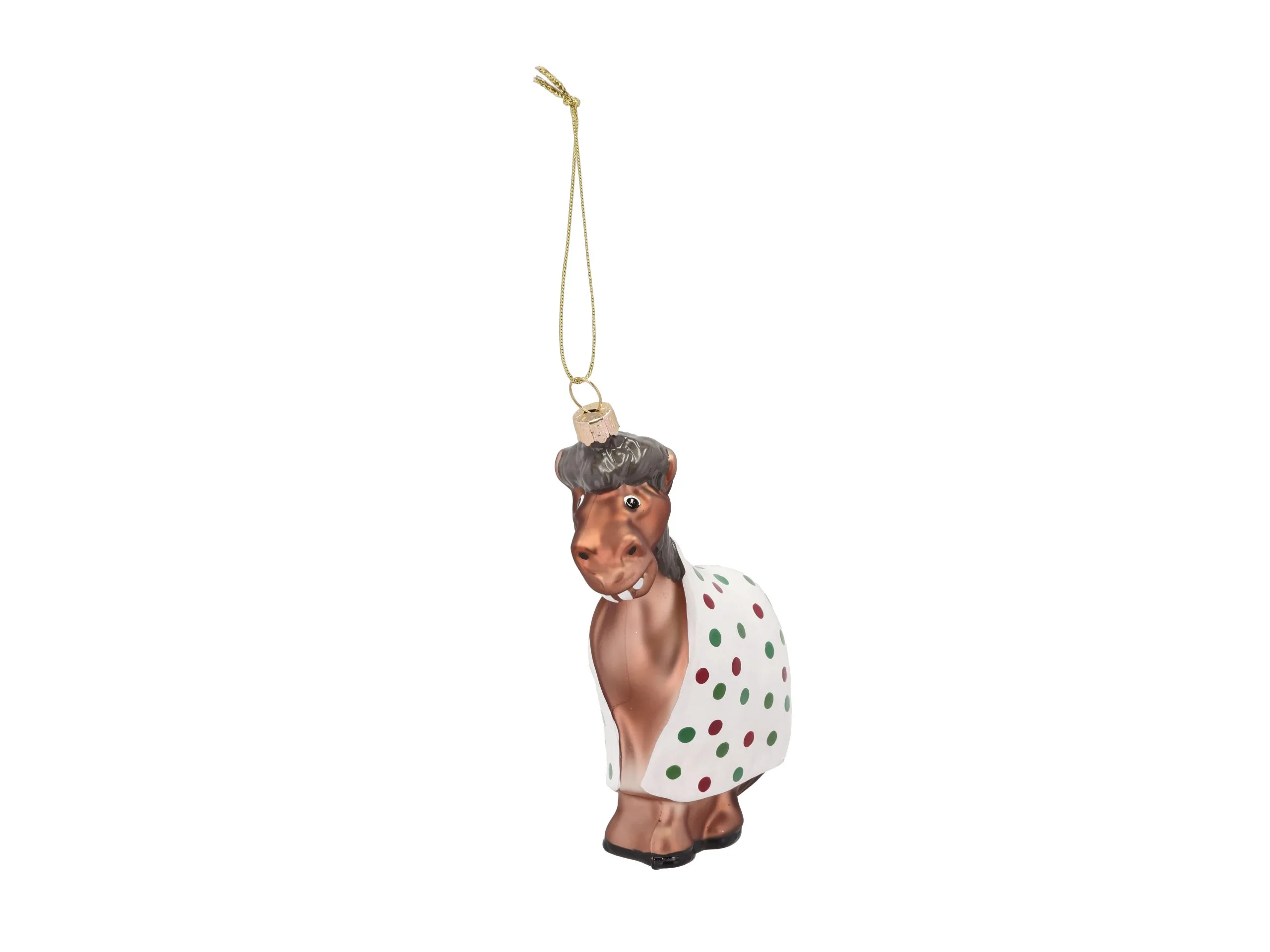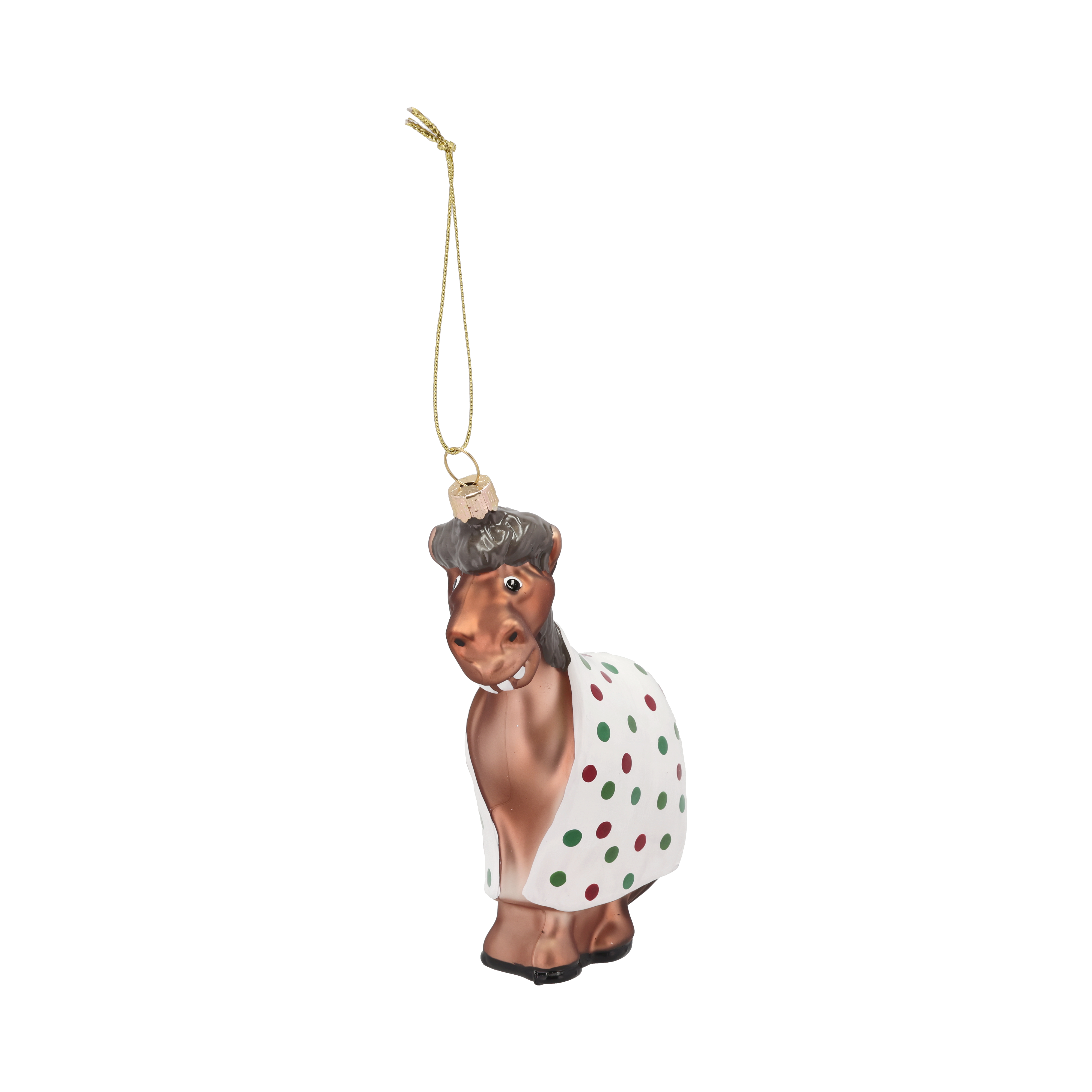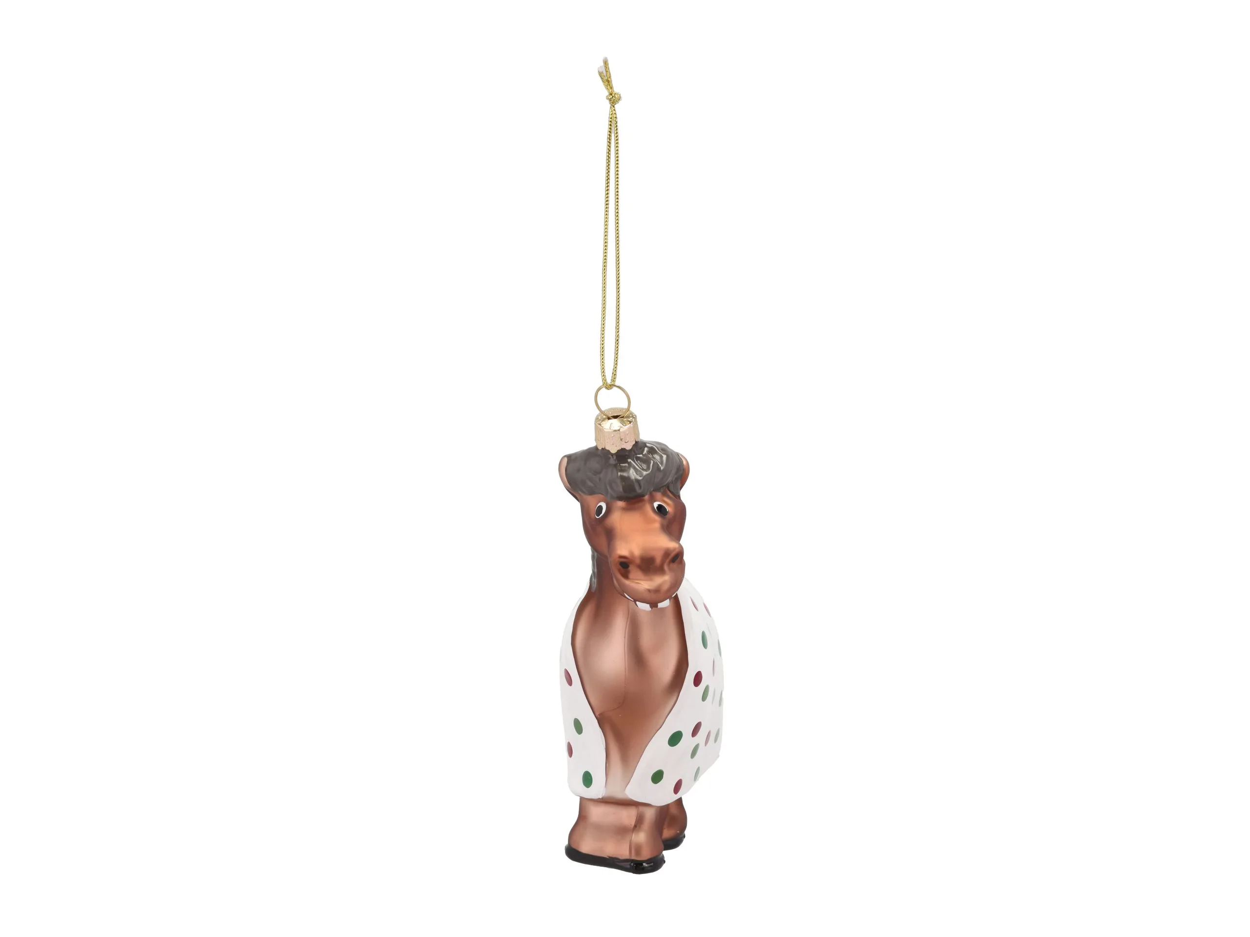 Hesten Harry har efterladt sit fødselsdagstog og er trukket i sit fine juletæppe med røde og grønne prikker. I en skinnende glasversion er han klar til at glimte om kap med de andre julekugler på træet.