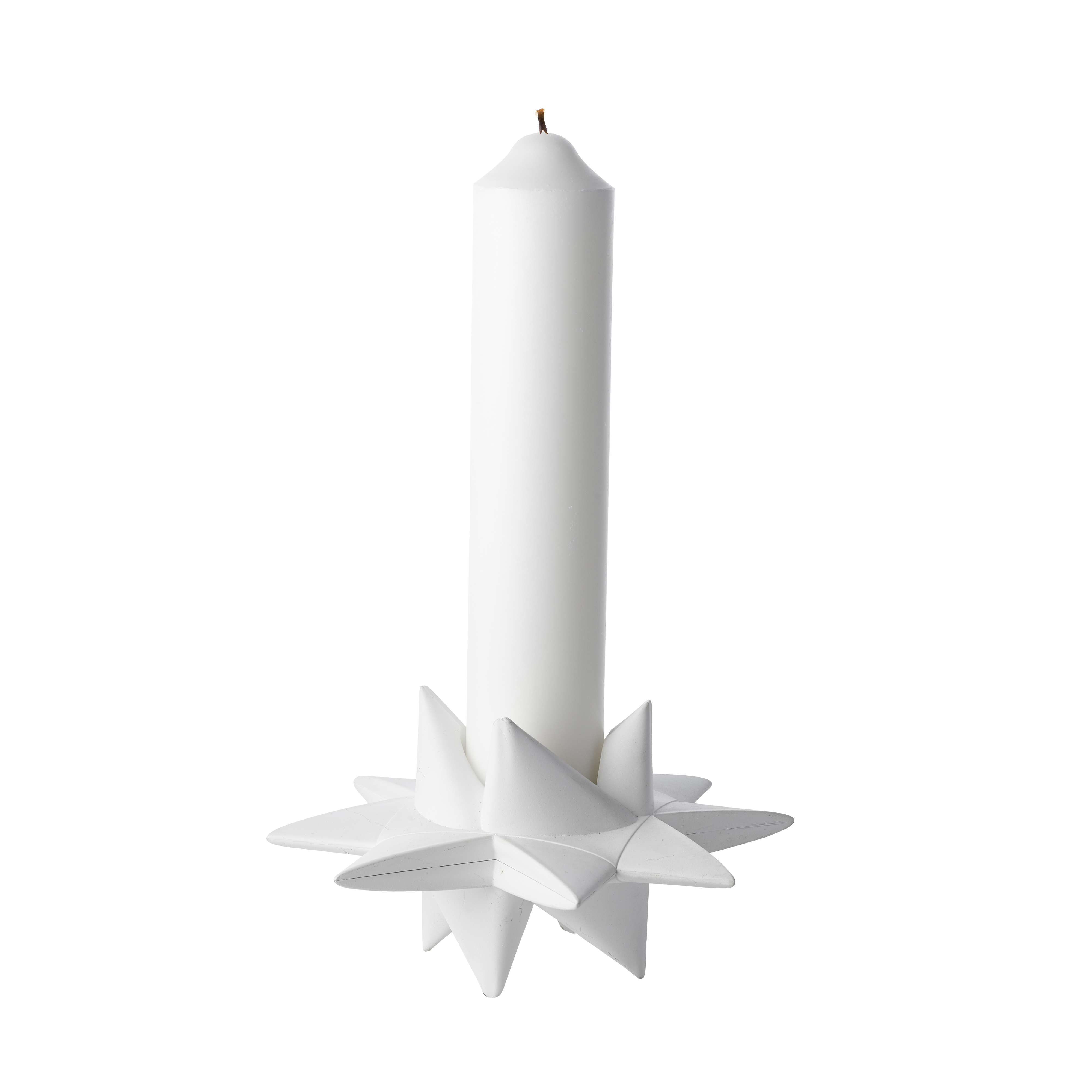 Sæt dit hyggelige kalenderlys i denne fine lysestage, der har samme form, farve og lethed som en sirligt flettet papirstjerne. Stjernen er lavet af polyresin og er 9 cm høj med en diameter på 17,5 cm. Til lys med dia. 5 cm. Design: Medusa-Copenhagen.