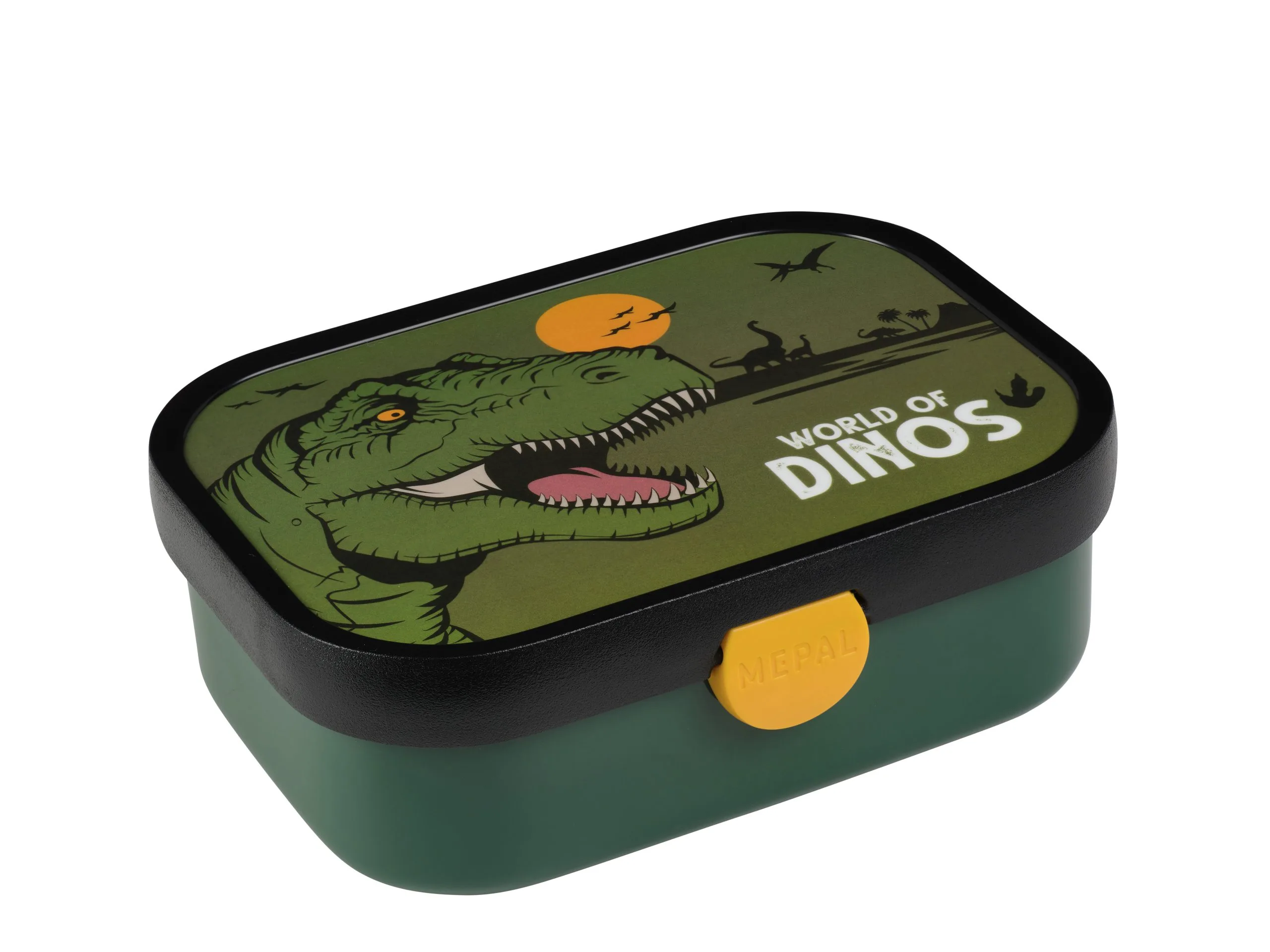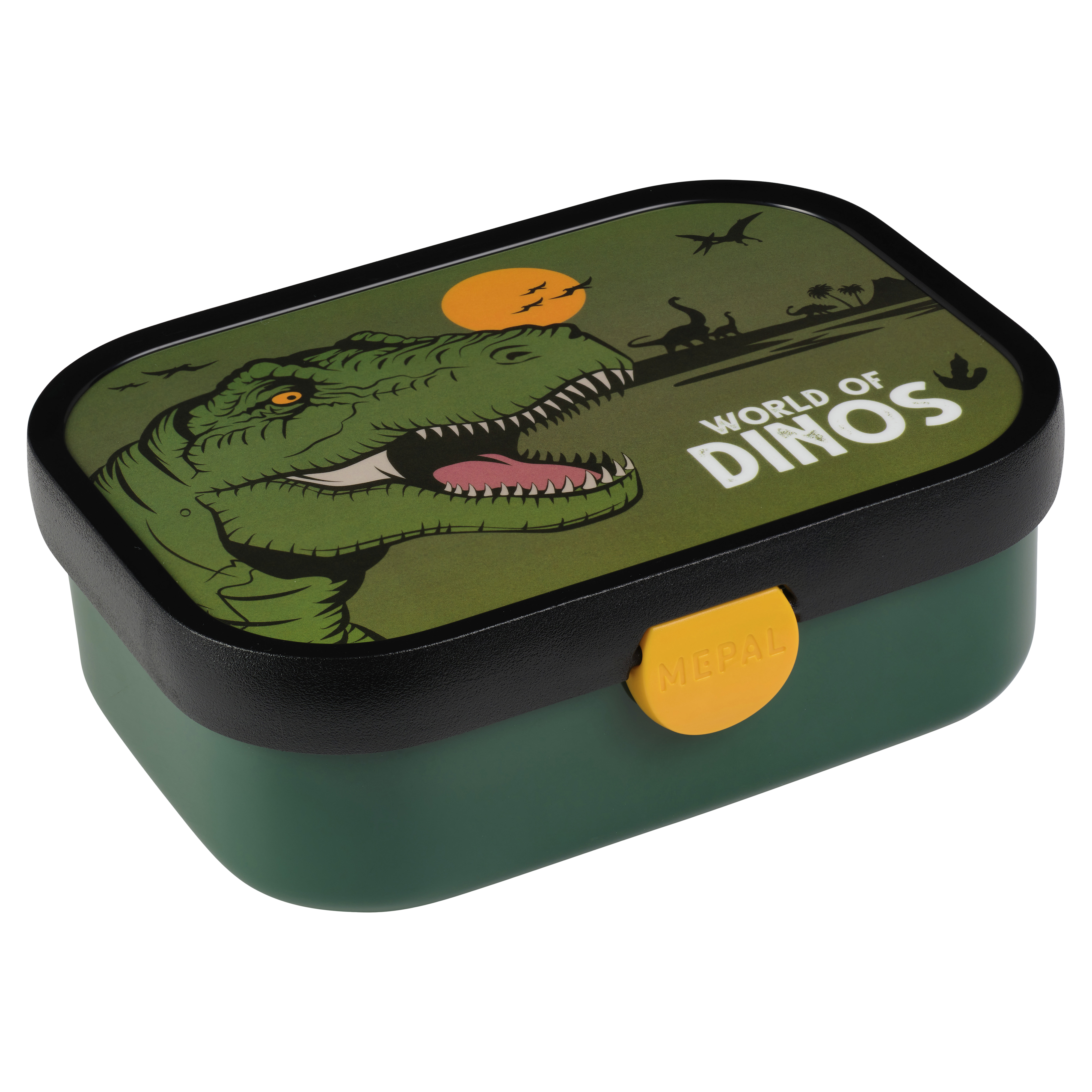 Madkasse med flotte illustrationer af klassiske dinosaurer. Den har en ny, forbedret lukkemekanisme, som er endnu nemmere for børnene at betjene. Madkassen måler 17,5 x 13 x 6 cm og indeholder en lille gaffel og en aftagelig indsats med to små rum.