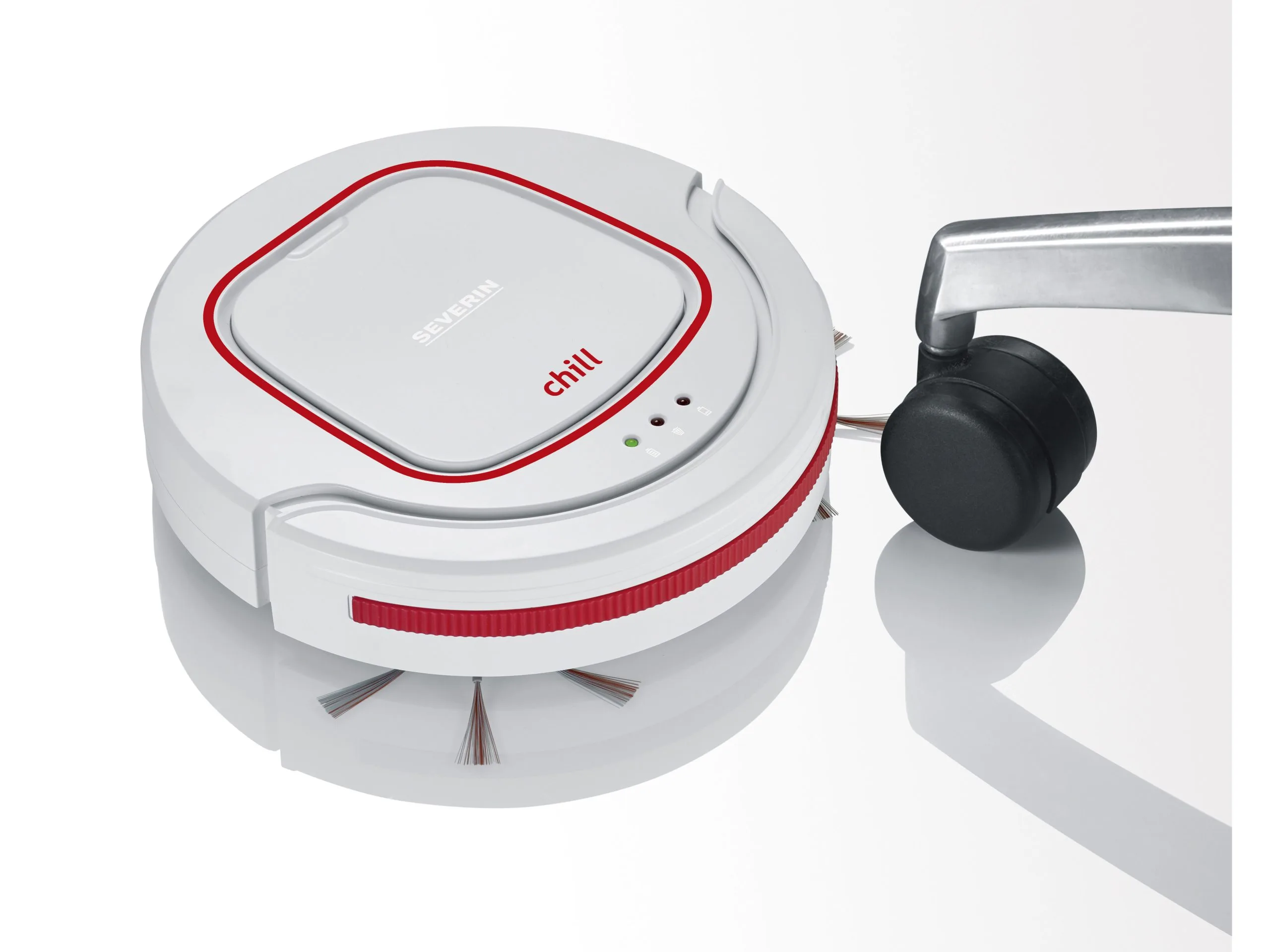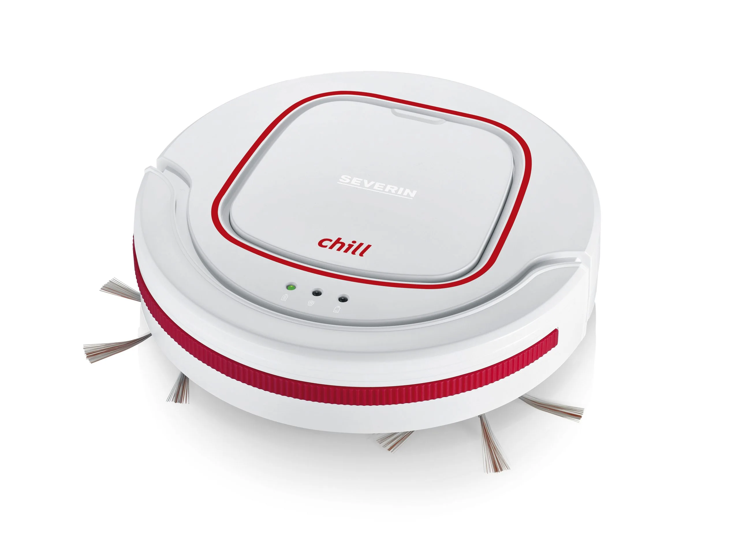Severin RB 7024 Robotstøvsuger Chill med kort ladetid, lang driftstid og lavt lydniveau. Perfekt til hårde gulve og korthårede tæpper. Ekstra lange rundbørster giver optimal rengøring i hjørner og langs kanter. Hvid/rød. Højde 7 cm.