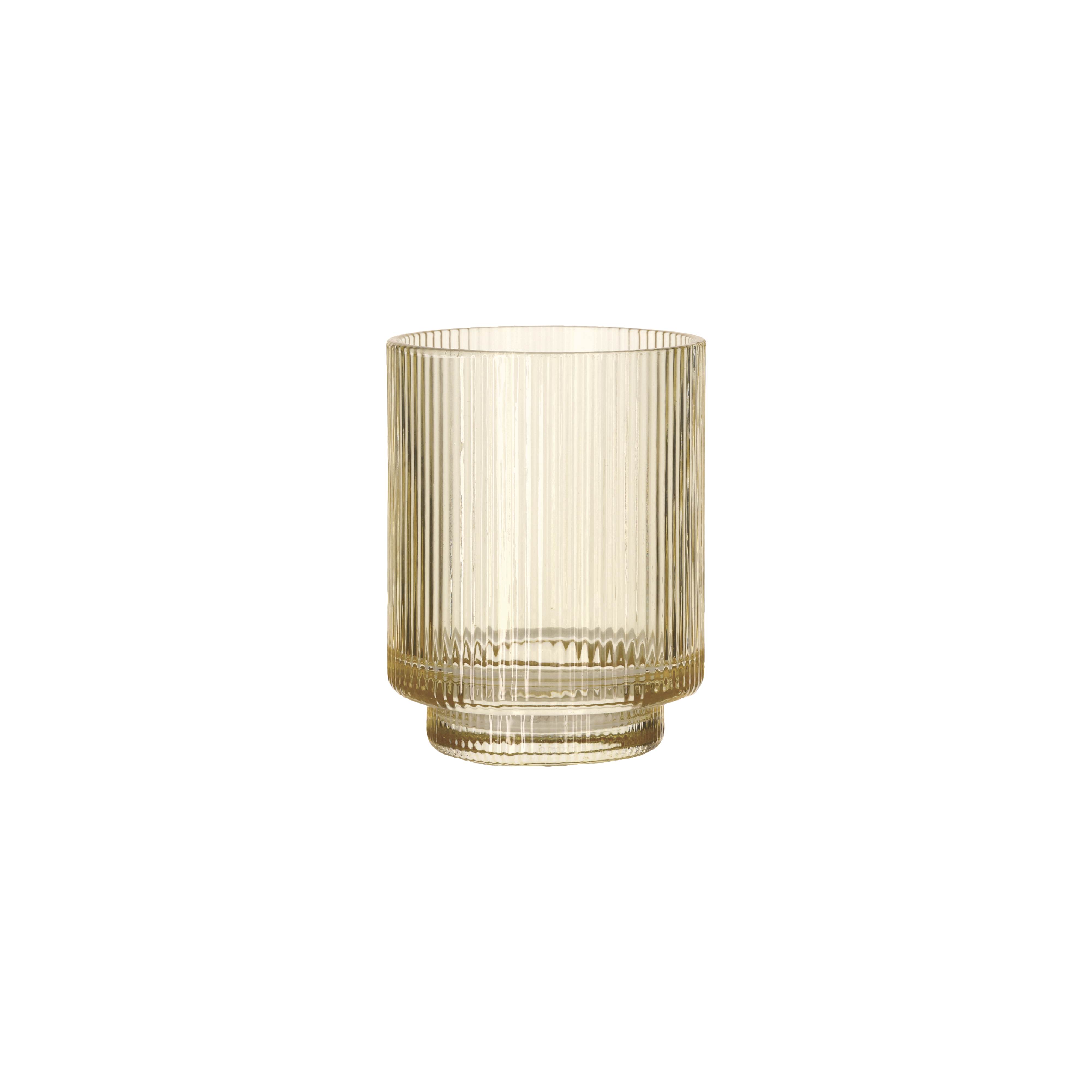 Clarity sæbedispenseren og tandbørsteholderen er lavet af riflet glas med et diskret bølgemønster. Den slanke silhuet giver et cool og elegant look.