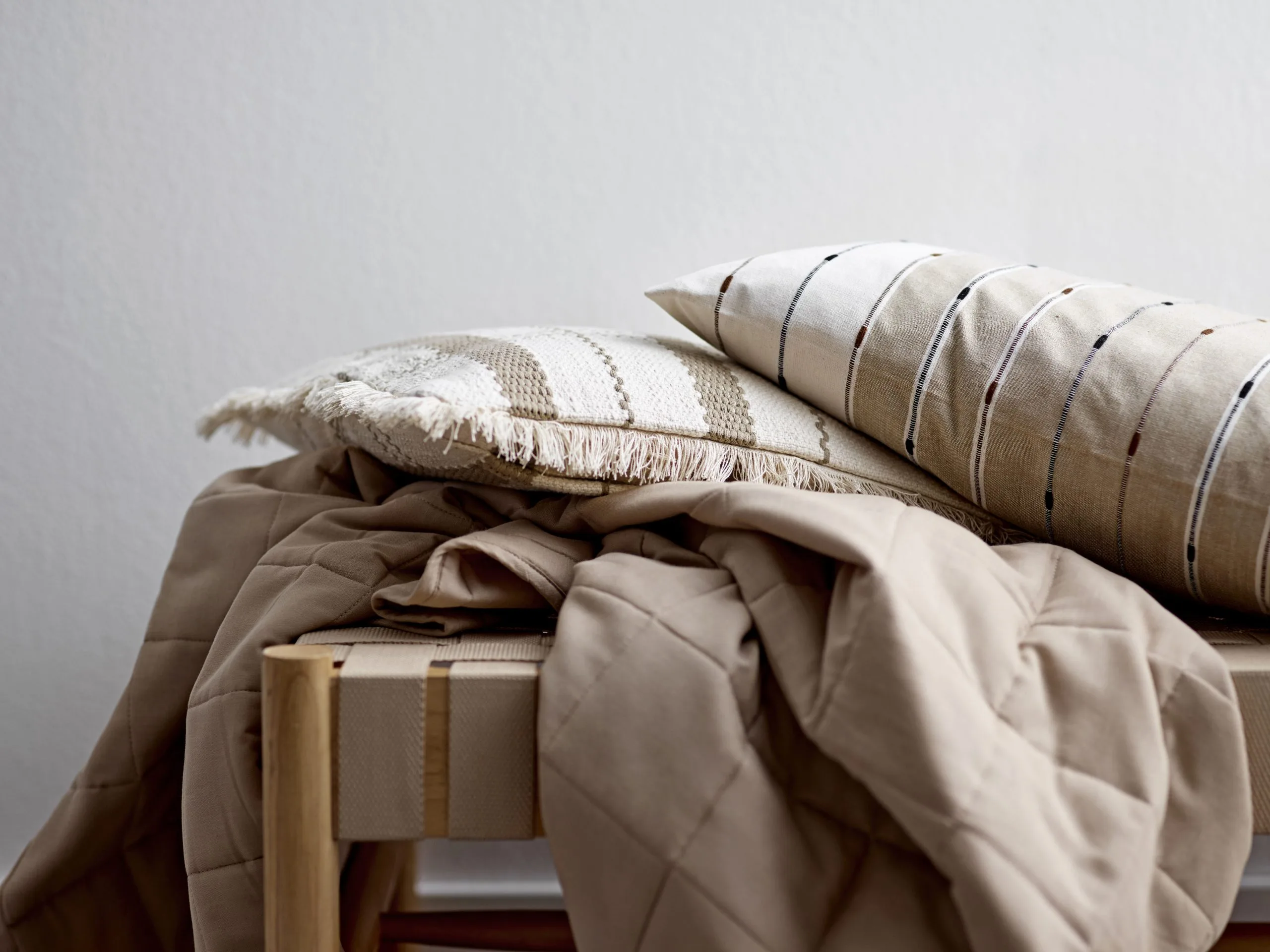 Mønsteret er tydeligt minimalistisk, men har samtidig et blødt bohemeagtigt udtryk. De lyse jordfarver har en nærmest meditativ tiltrækningskraft.