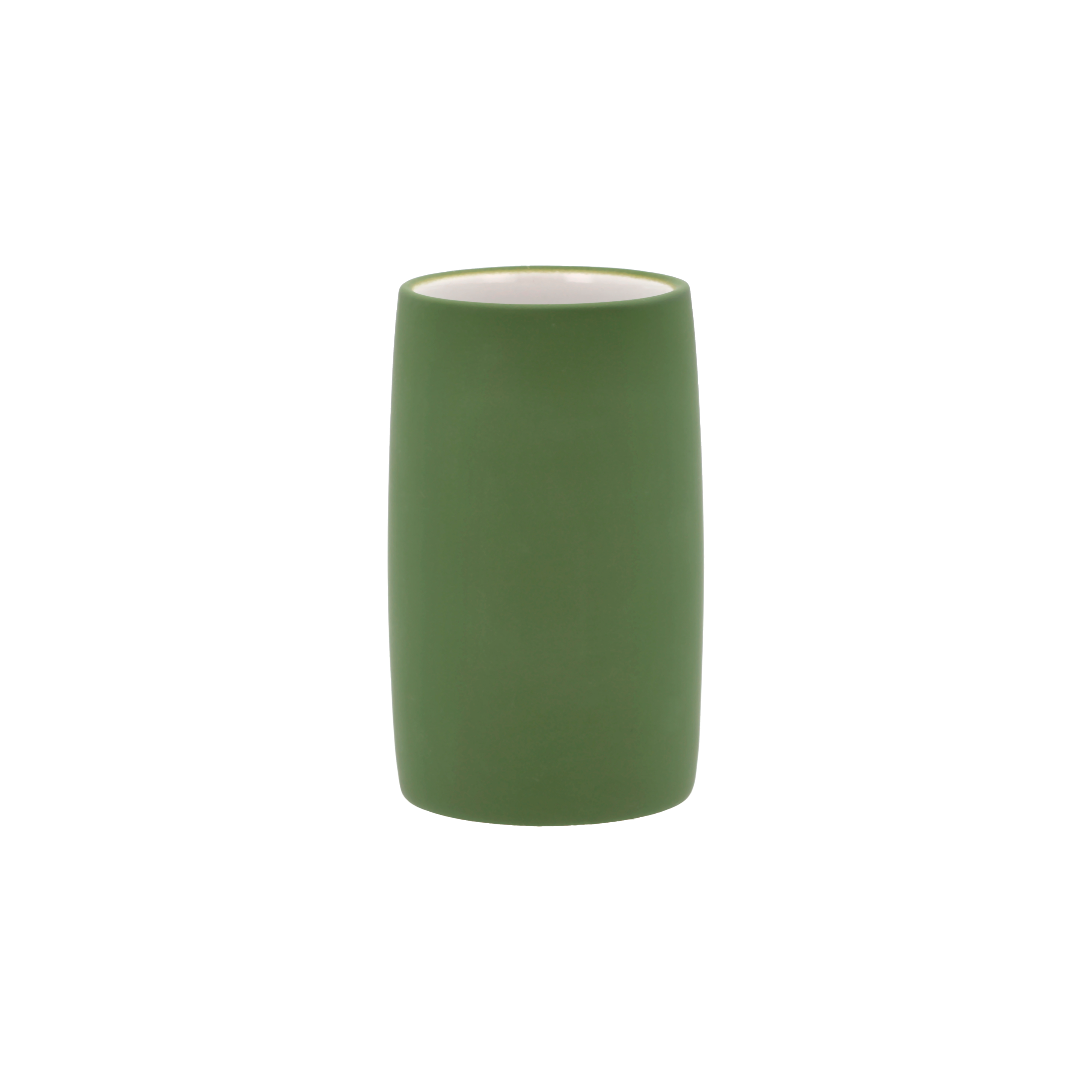 Södahls matte badserie har soft rubbercoating all over, også på sæbedispensertud og toiletbørsteskaft. Kruset er med lækker kontrastfarvet, blank glasur indvendigt.