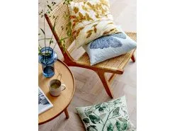 Disse simple blomster, tegnet i én enkelt streg, udgør et fint, flydende og feminint mønster. Den håndtegnede stil og de ultrafine linjer på den ensfarvede baggrund er beroligende for øjet. Både pude og plaid har en doubleface-effekt, bagsiden er et smukt gradueret melange motiv.