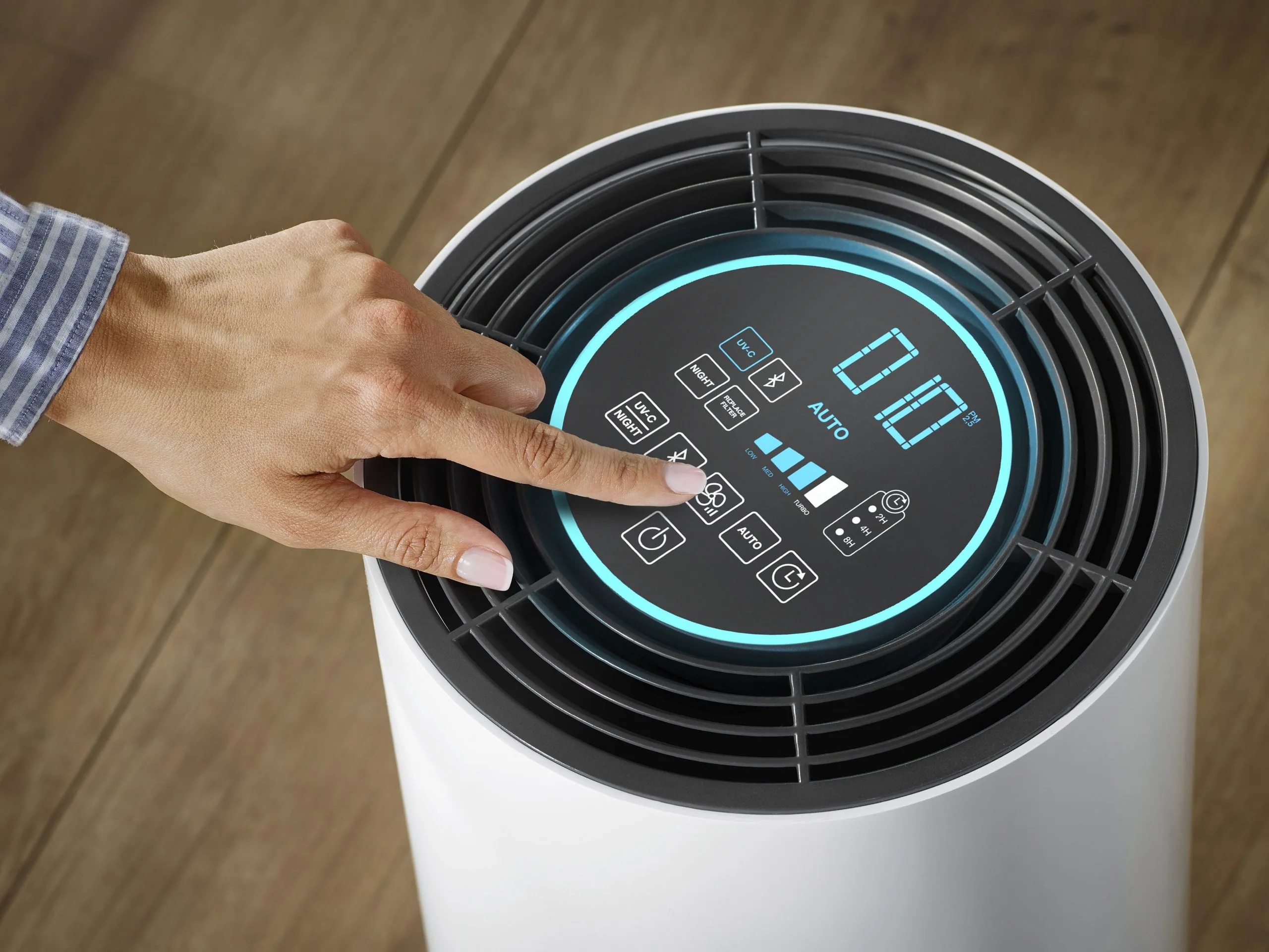 Filtrerer lugte, vira, bakterier, pollen, dyrehår, partikler, husstøv, husstøvmider og flygtige organiske forbindelser og viser luftkvaliteten gennem farveskala og nummerdisplay (PM 2,5)