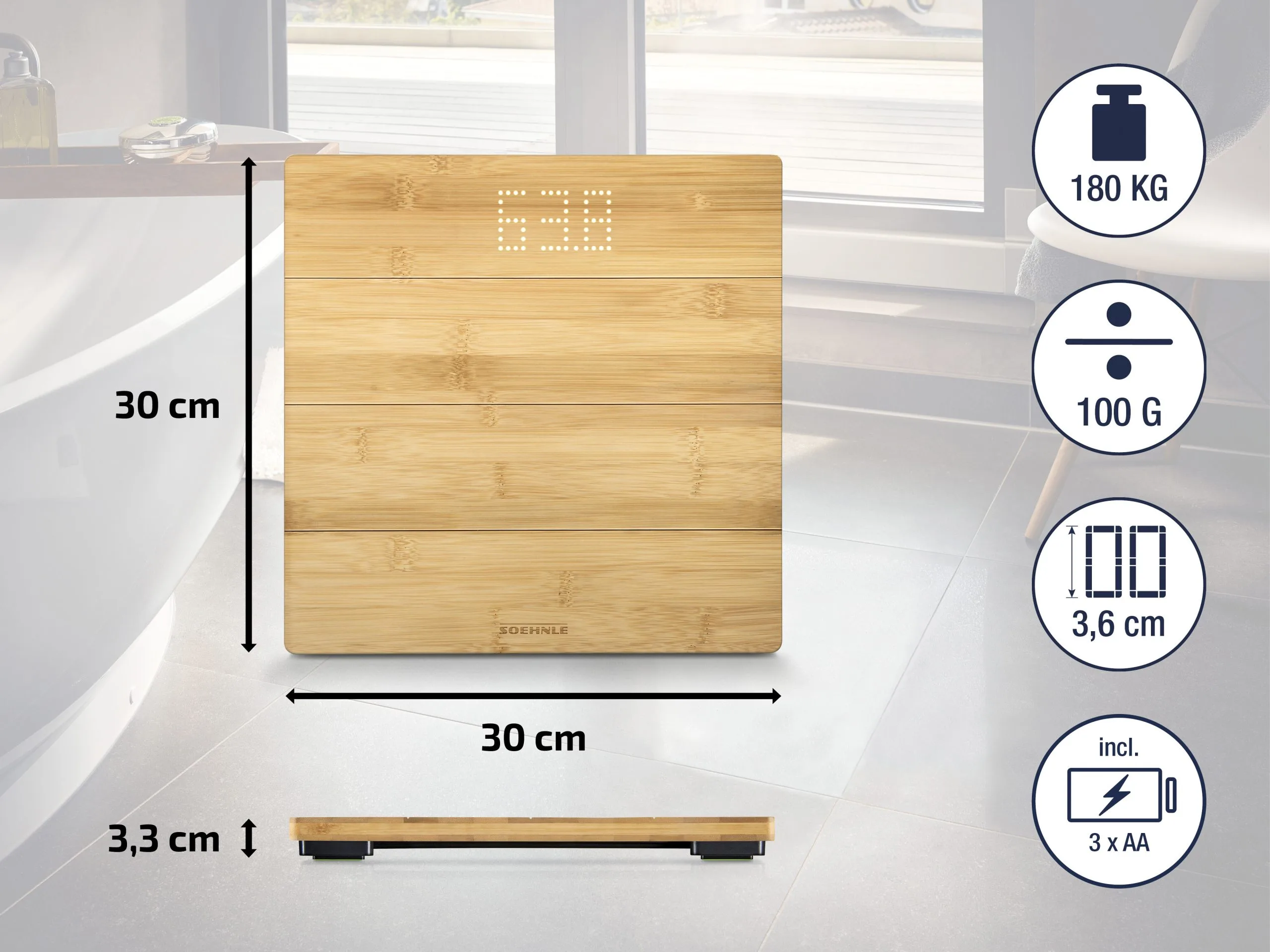 Det store LED-display har hvide tal, der kun lyser, når vægten er i brug. Den store vejeplatform, det slanke design og de skridsikre fødder sikrer maksimal sikkerhed og komfort, når man står på vægten. Vægten vises op til 180 kg i 100 g nøjagtige intervaller. Derefter slukkes Style Sense Bamboo Magic automatisk. Det er energieffektivt og sikrer lang tids brug af de medfølgende batterier.