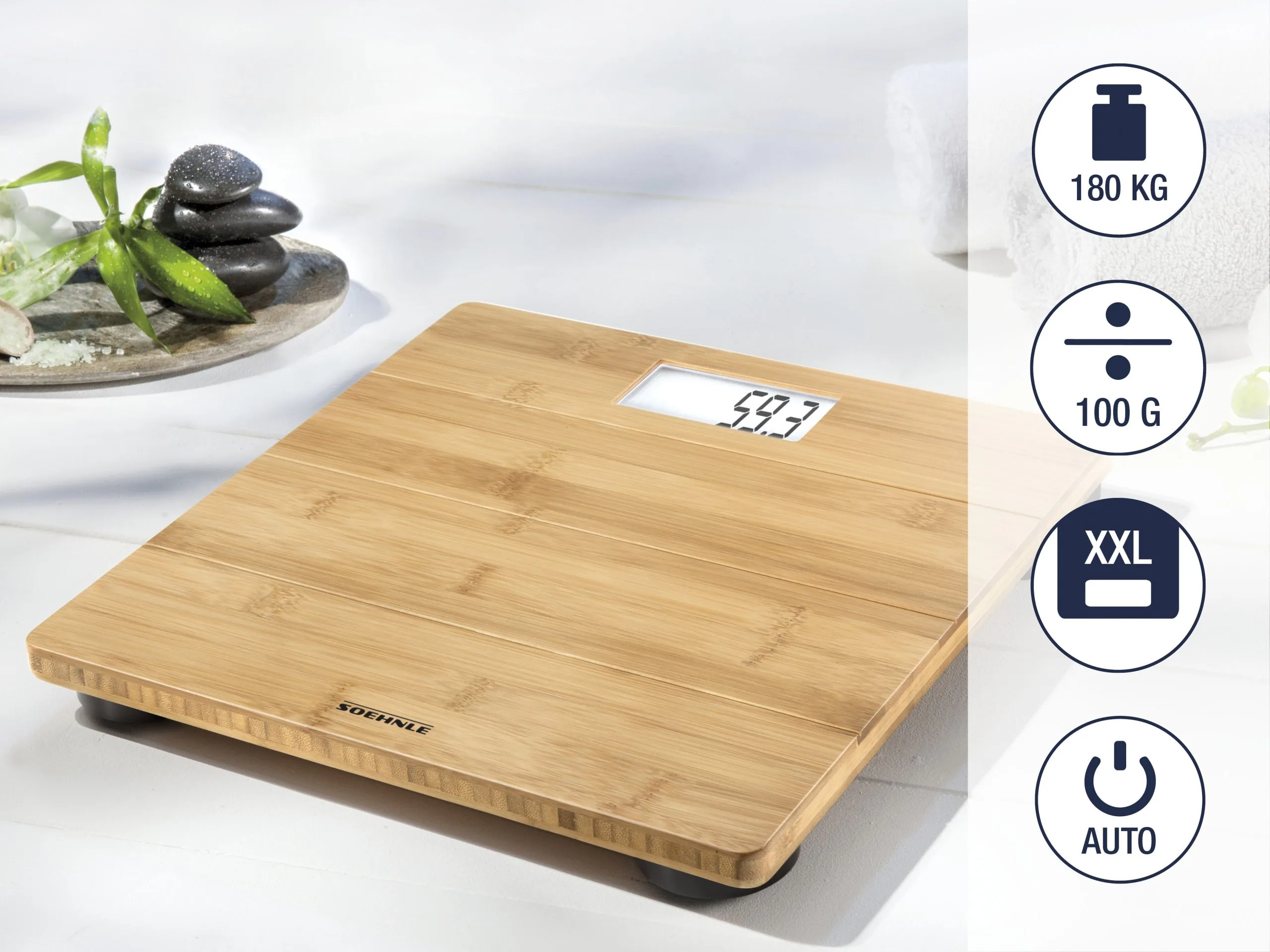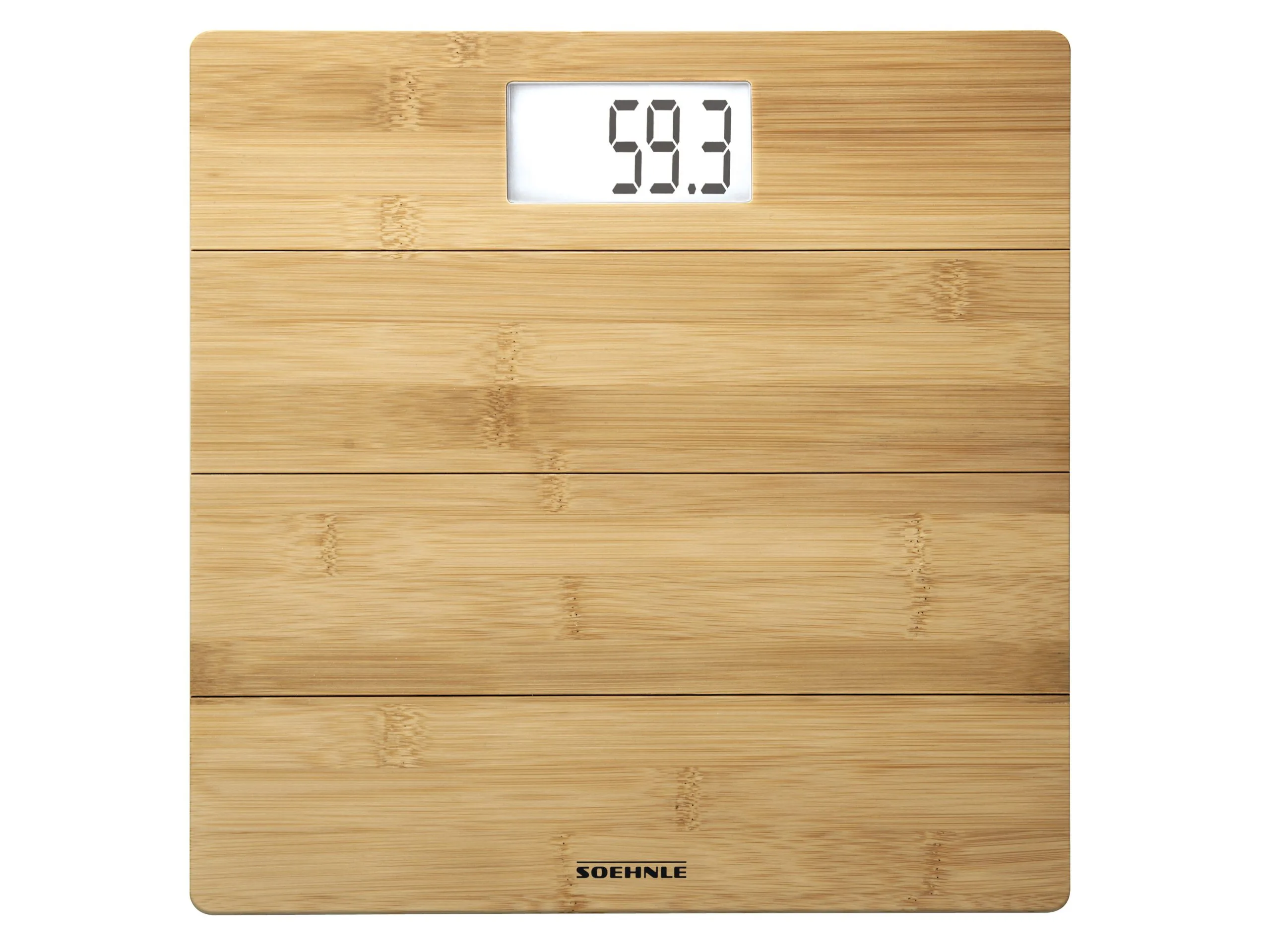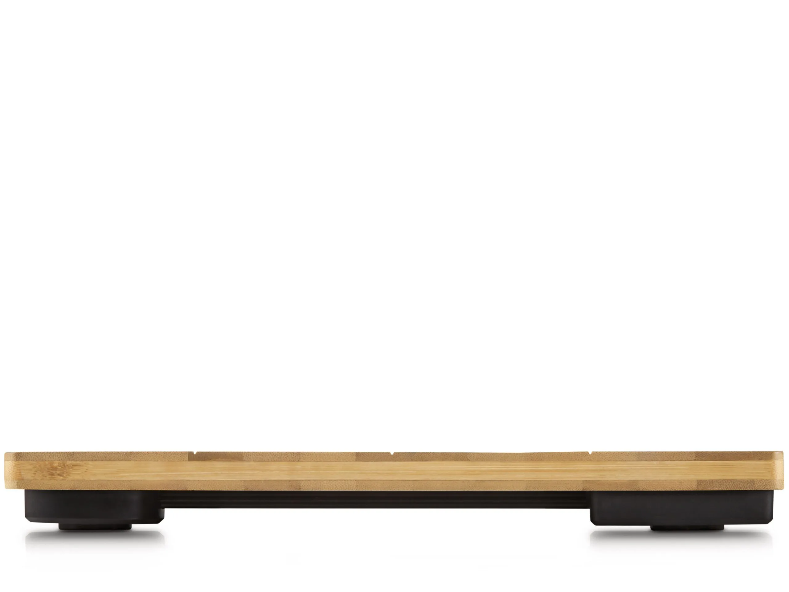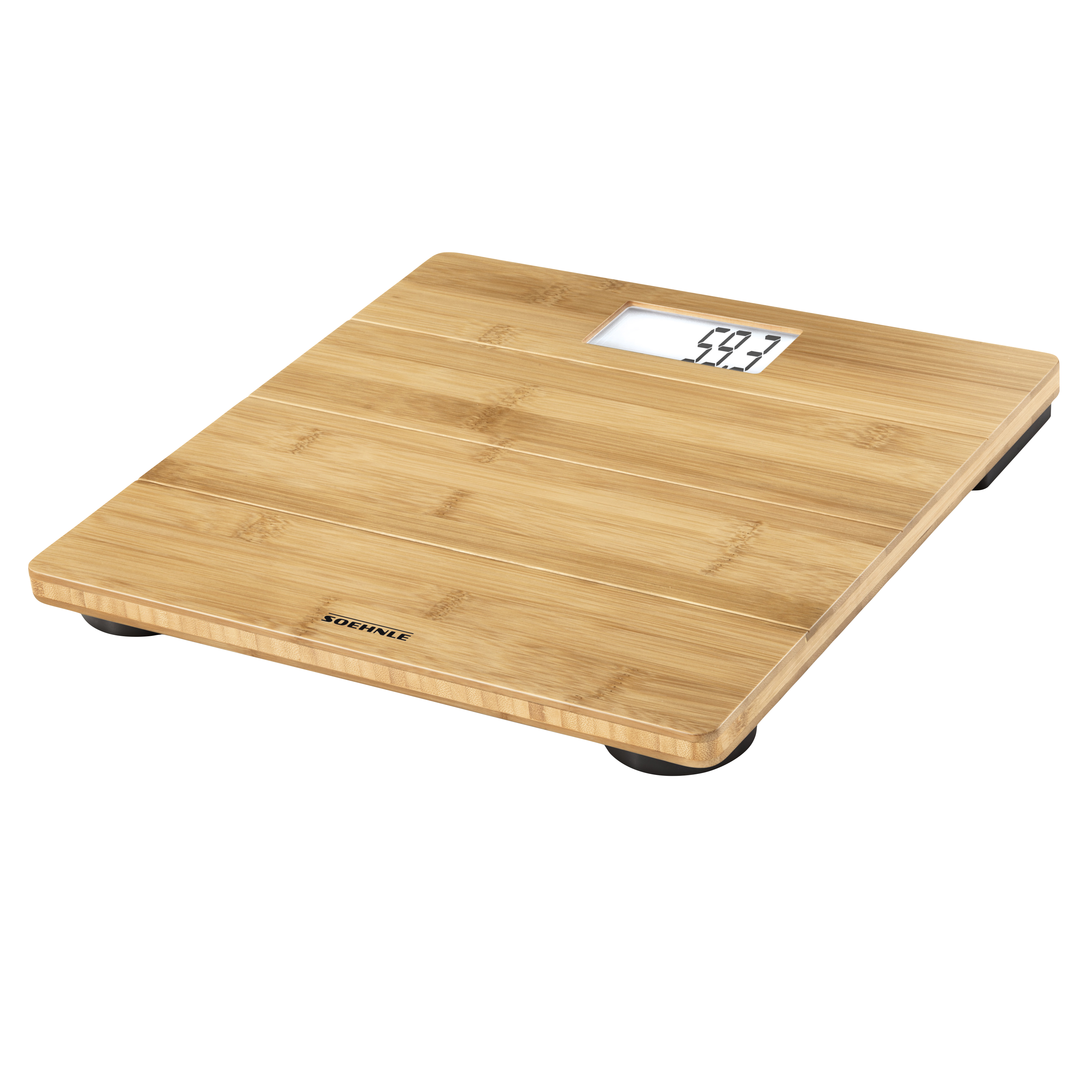 Trendy og anderledes digital personvægt med bambusoverflade.