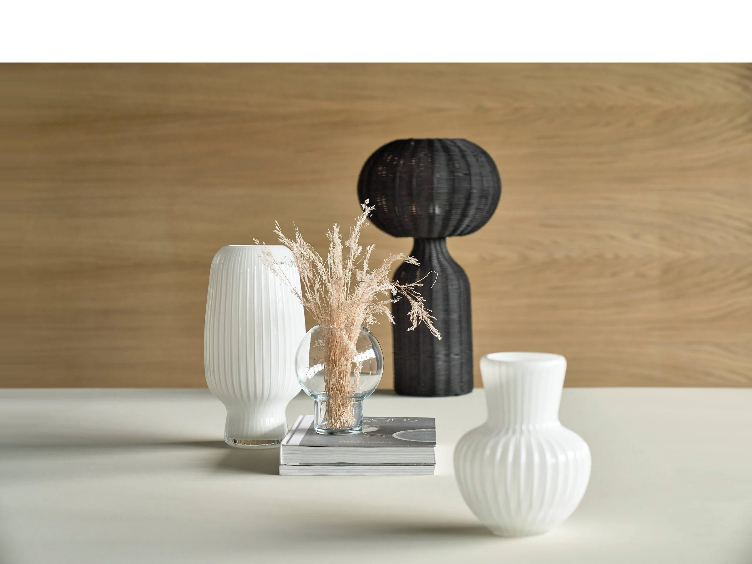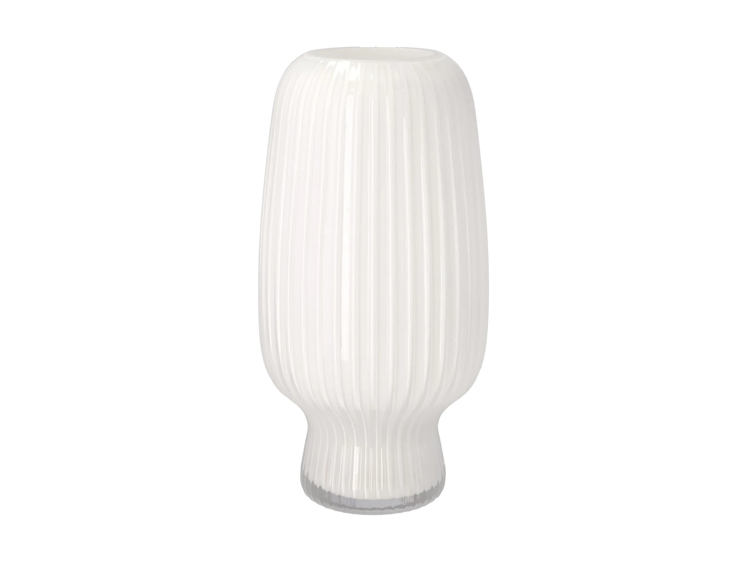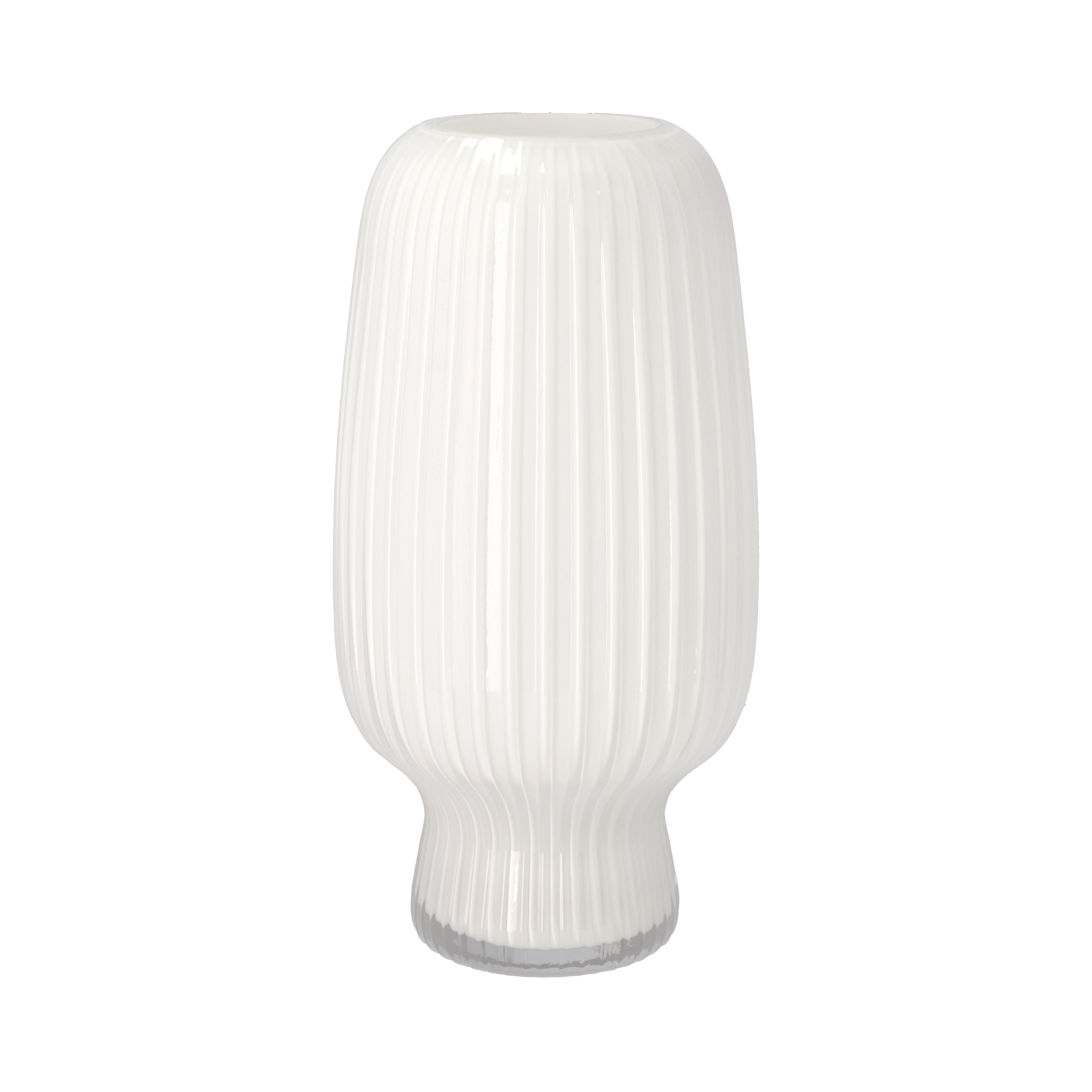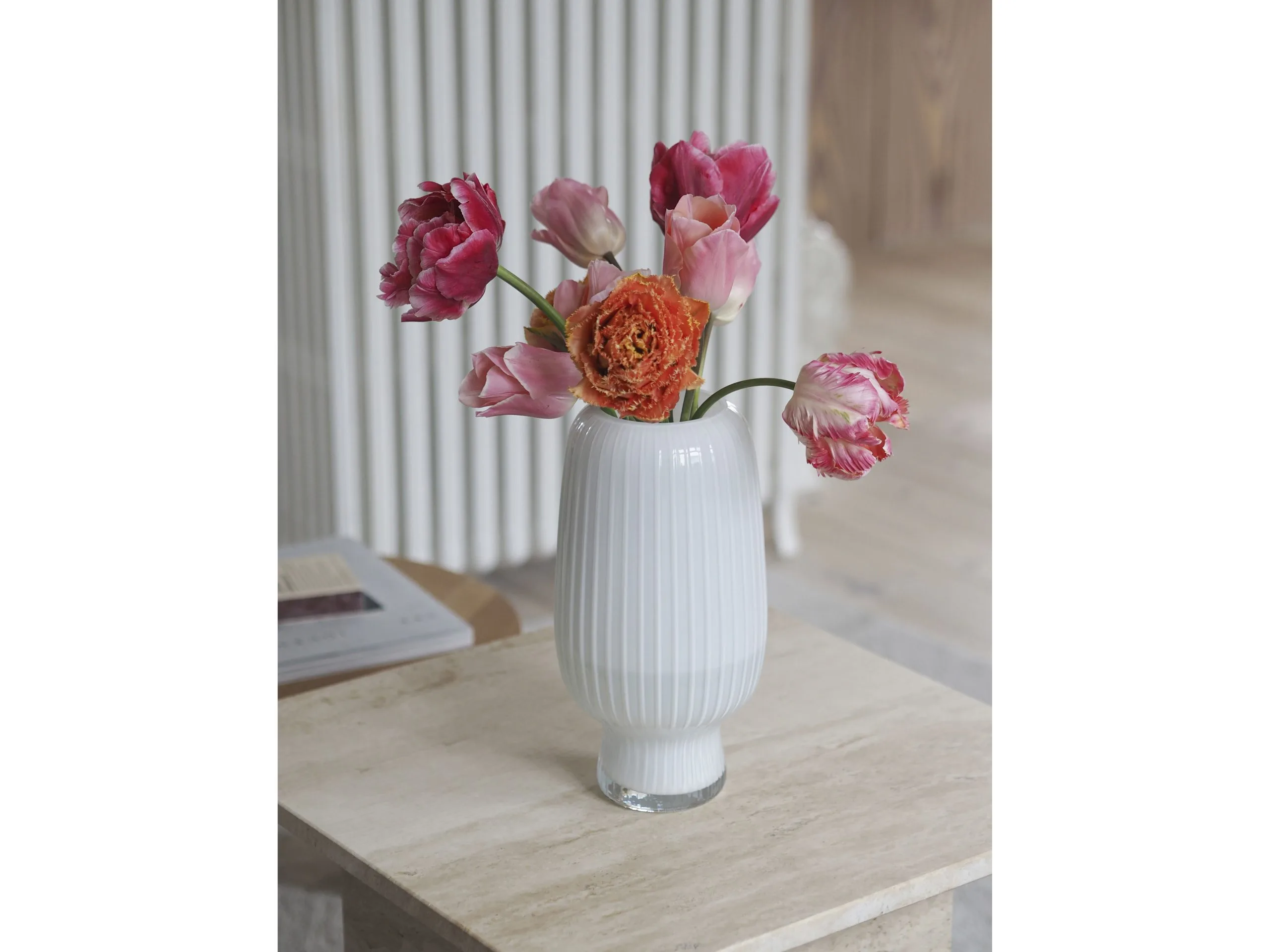 Elegant håndlavet vase i mundblæst glas. Det inderste lag er hvidt glas, mens yderlaget er i klart glas. D 16 x H 31,5 cm. Vasens smukke form klæder både friske og tørrede blomster. Rengøres med varmt vand og efterfølgende overtørring med en blød klud.