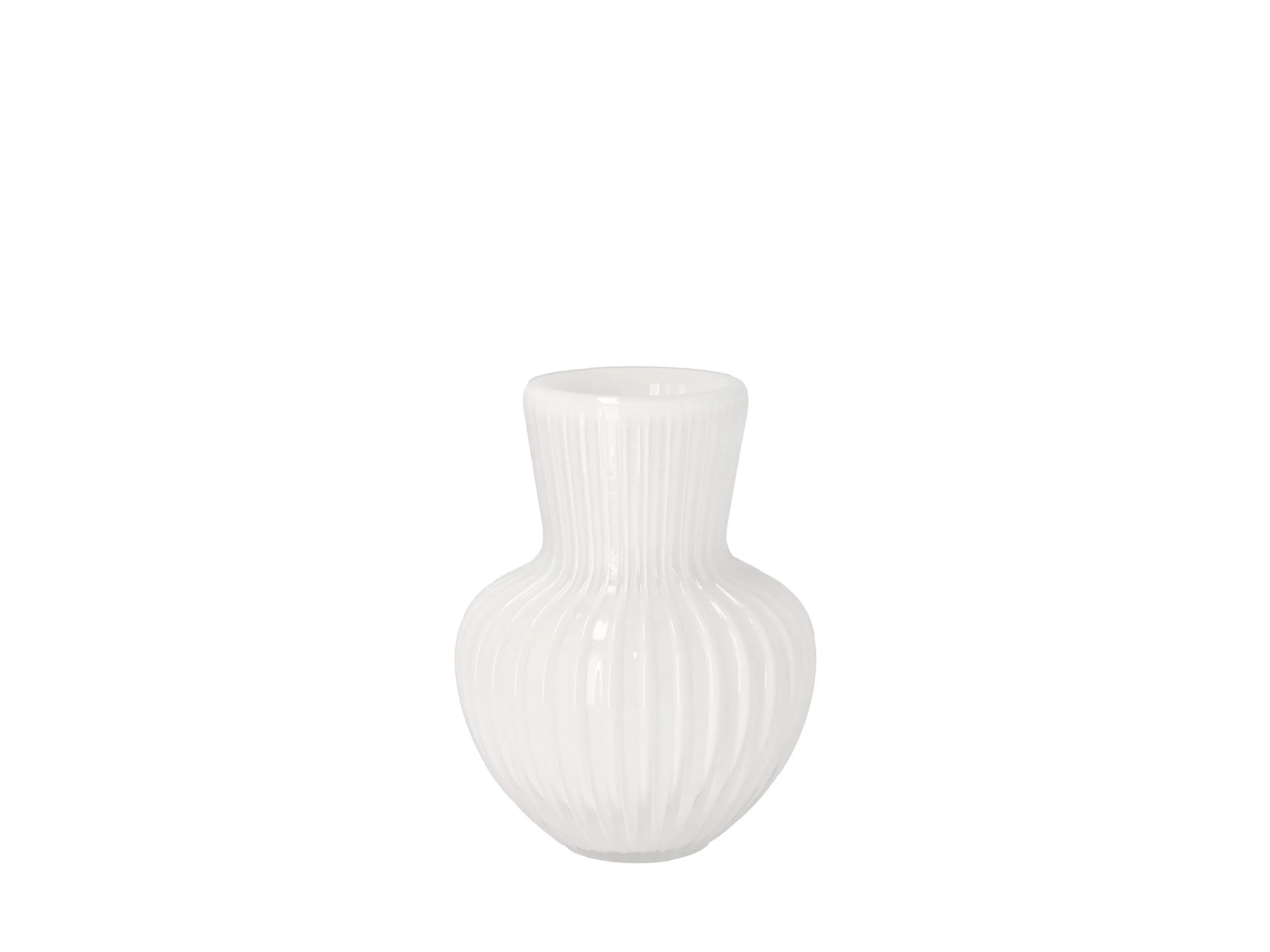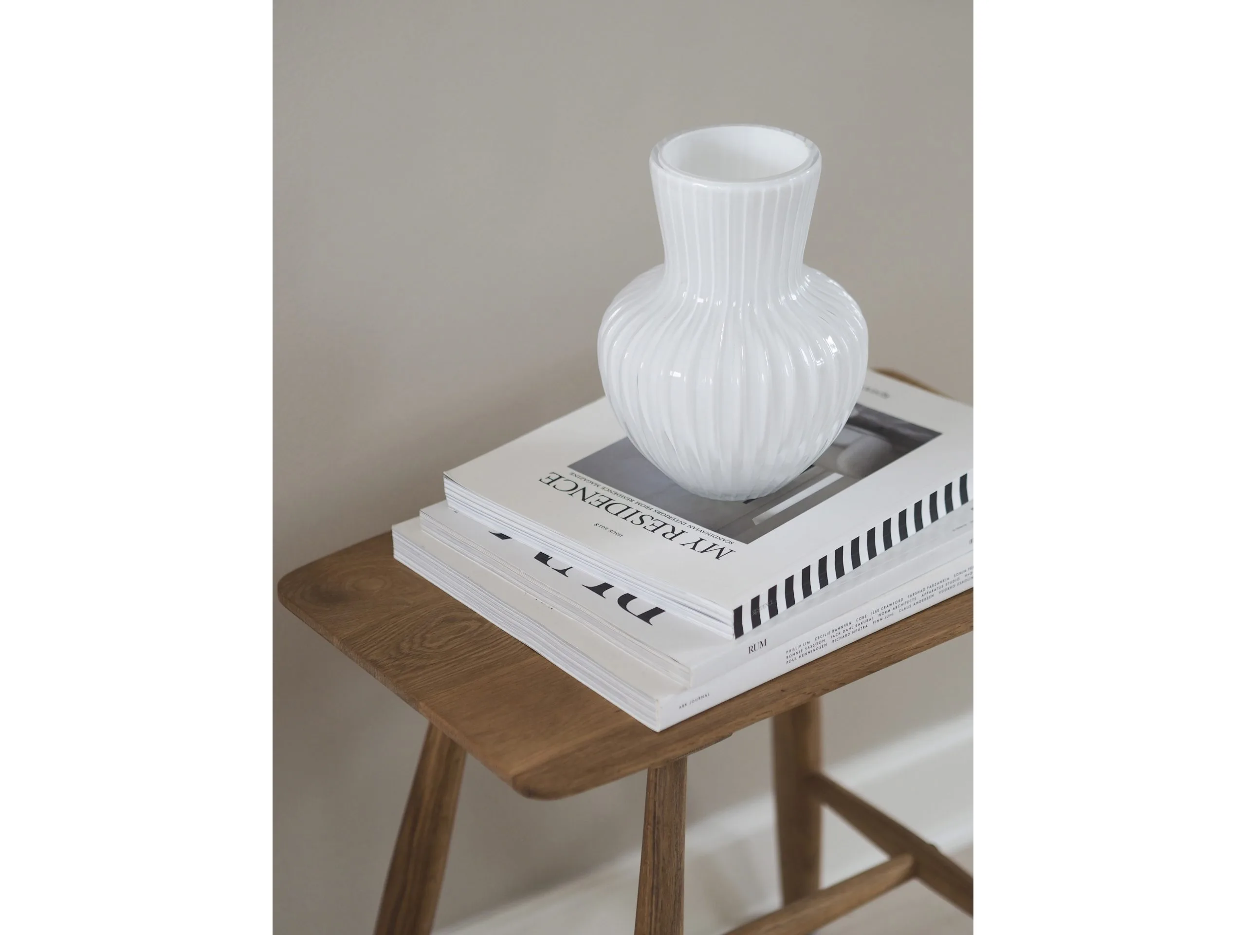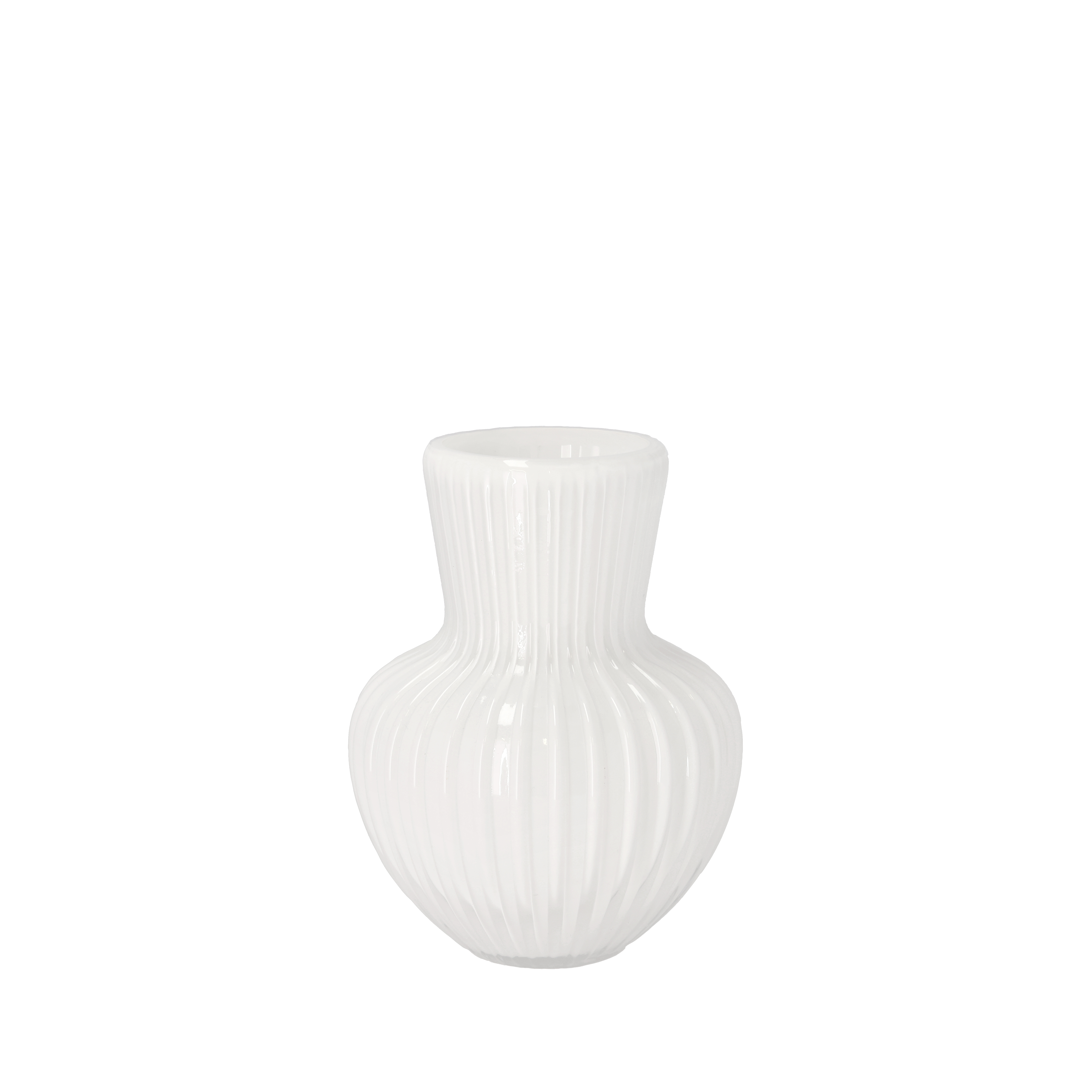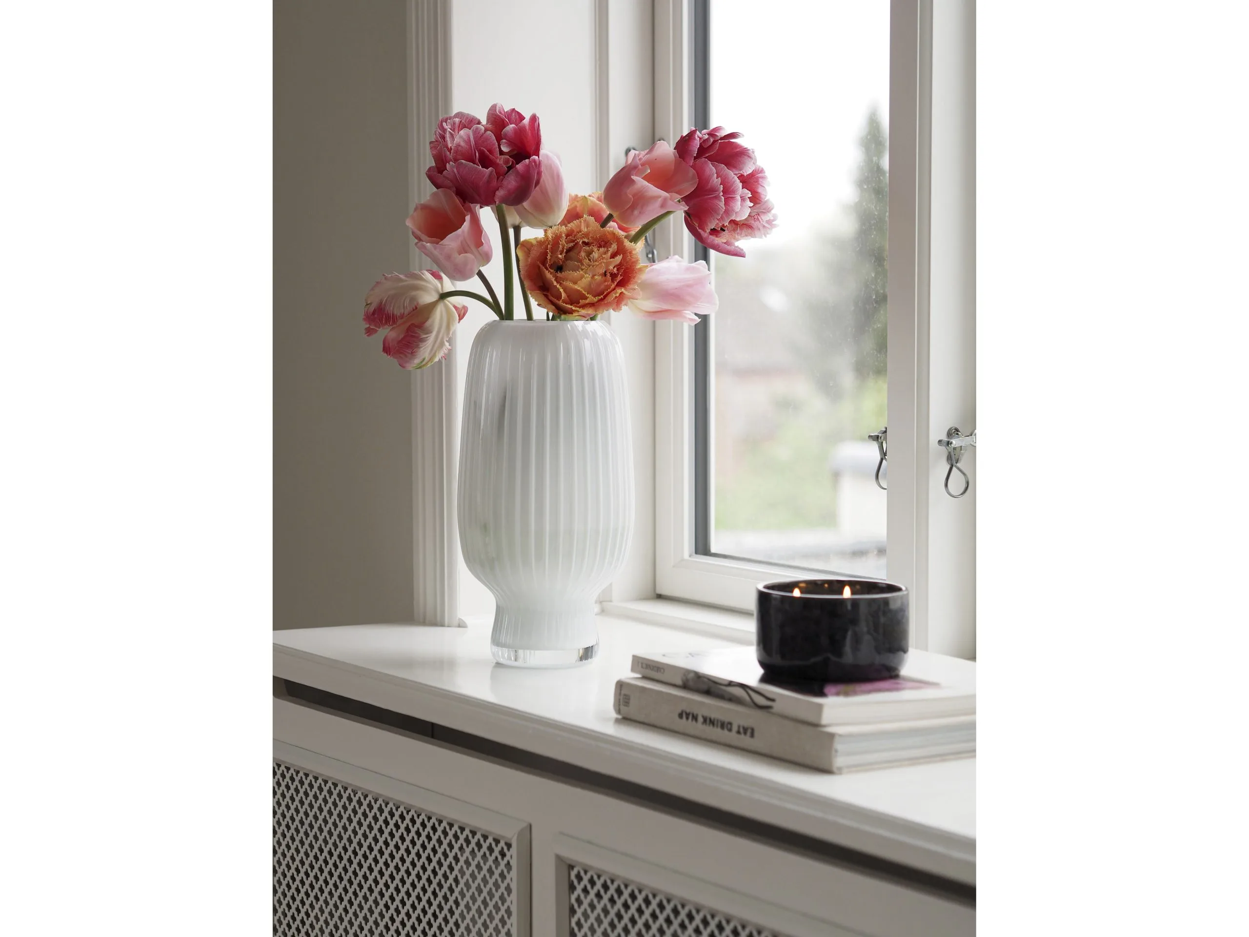 Elegant håndlavet vase i mundblæst glas. Det inderste lag er hvidt glas, mens yderlaget er i klart glas. D 16 x H 31,5 cm. Vasens smukke form klæder både friske og tørrede blomster. Rengøres med varmt vand og efterfølgende overtørring med en blød klud.