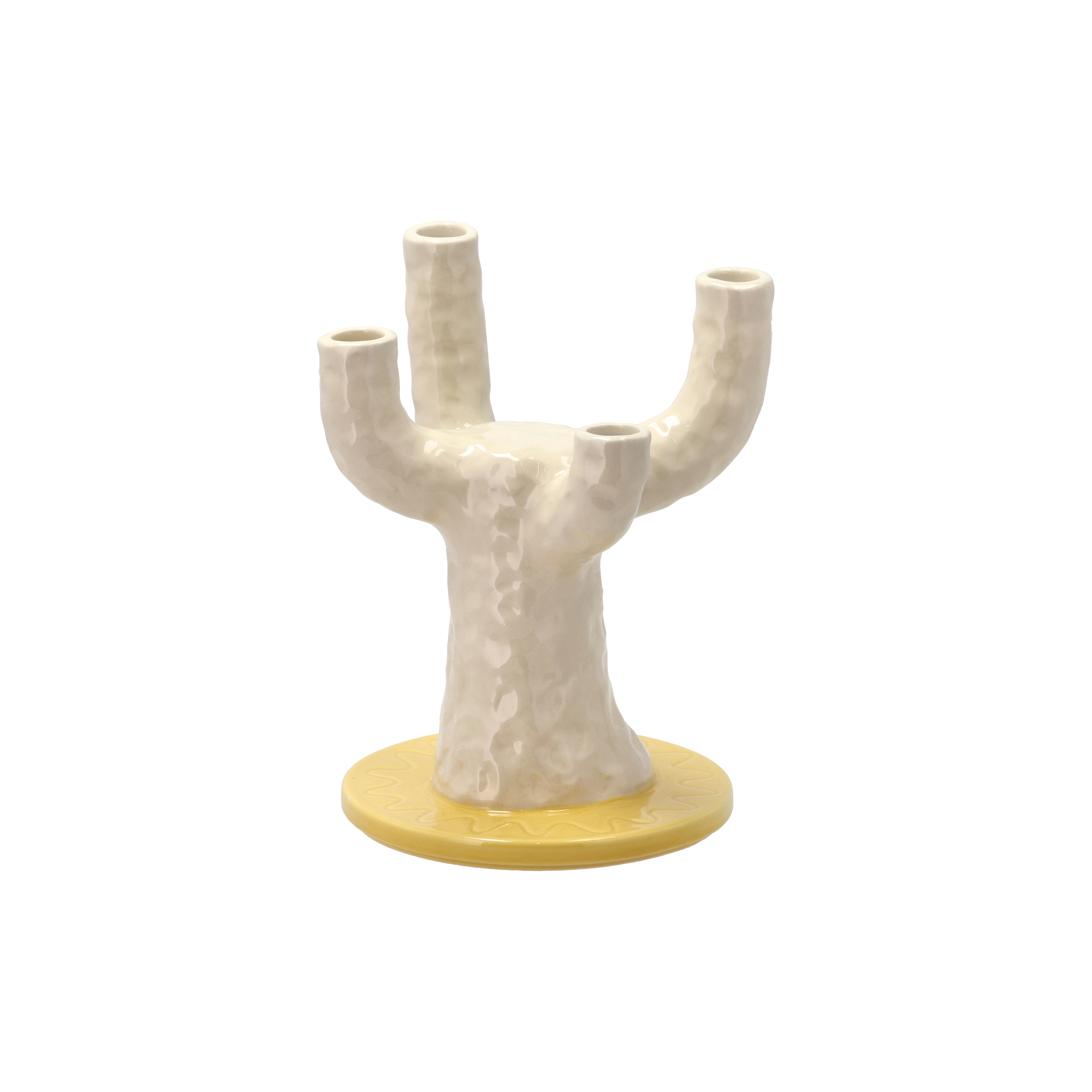 Lysestage i stentøj med et organisk formsprog. Lysestagen er inspireret af træer med grene, der strækker sig op mod himlen. Lysestagens rustikke look leder tankerne hen på håndlavet keramik. Bundens gule farve giver håb og glæde, samtidig med at den er klassisk og nordisk.