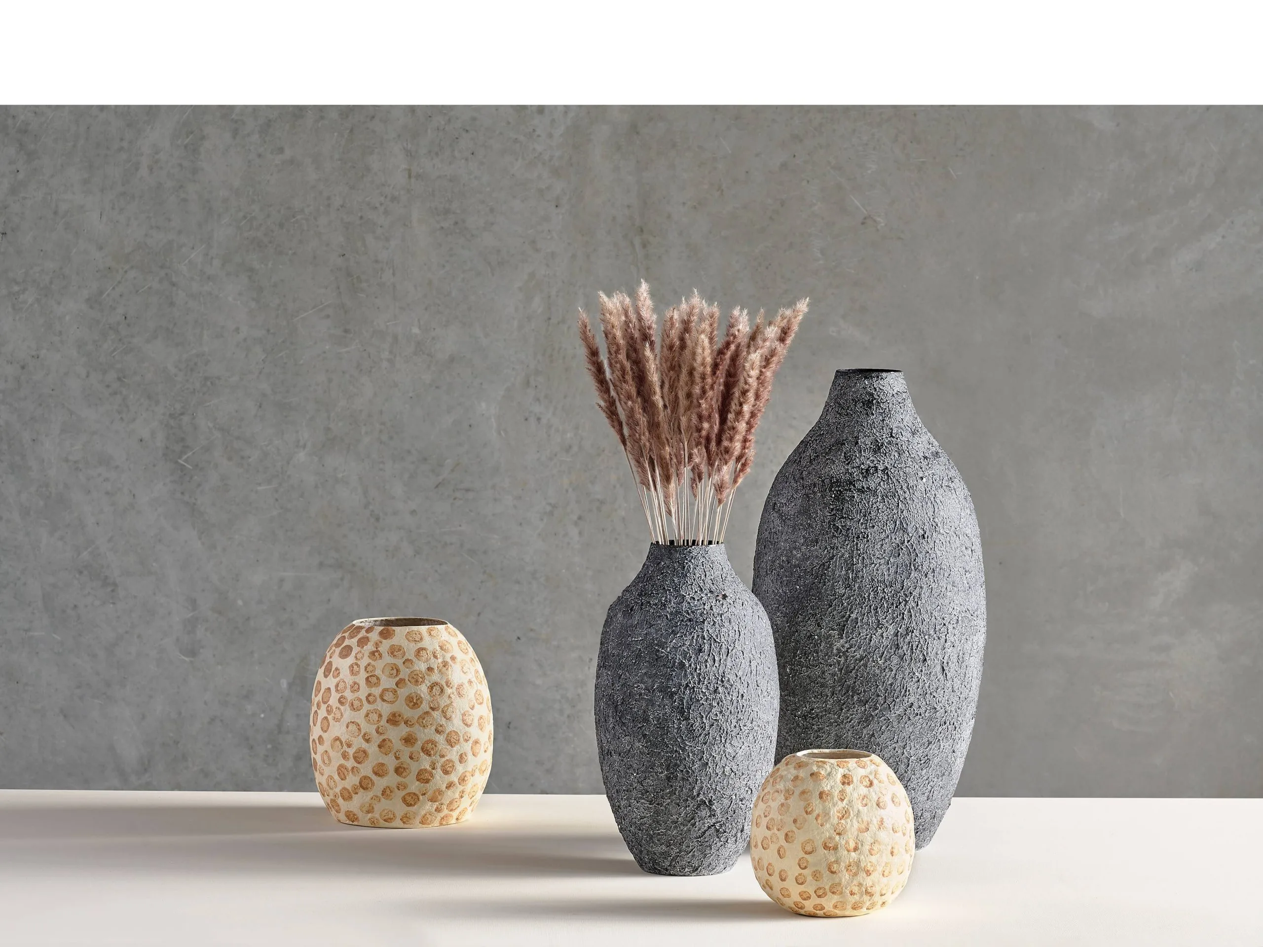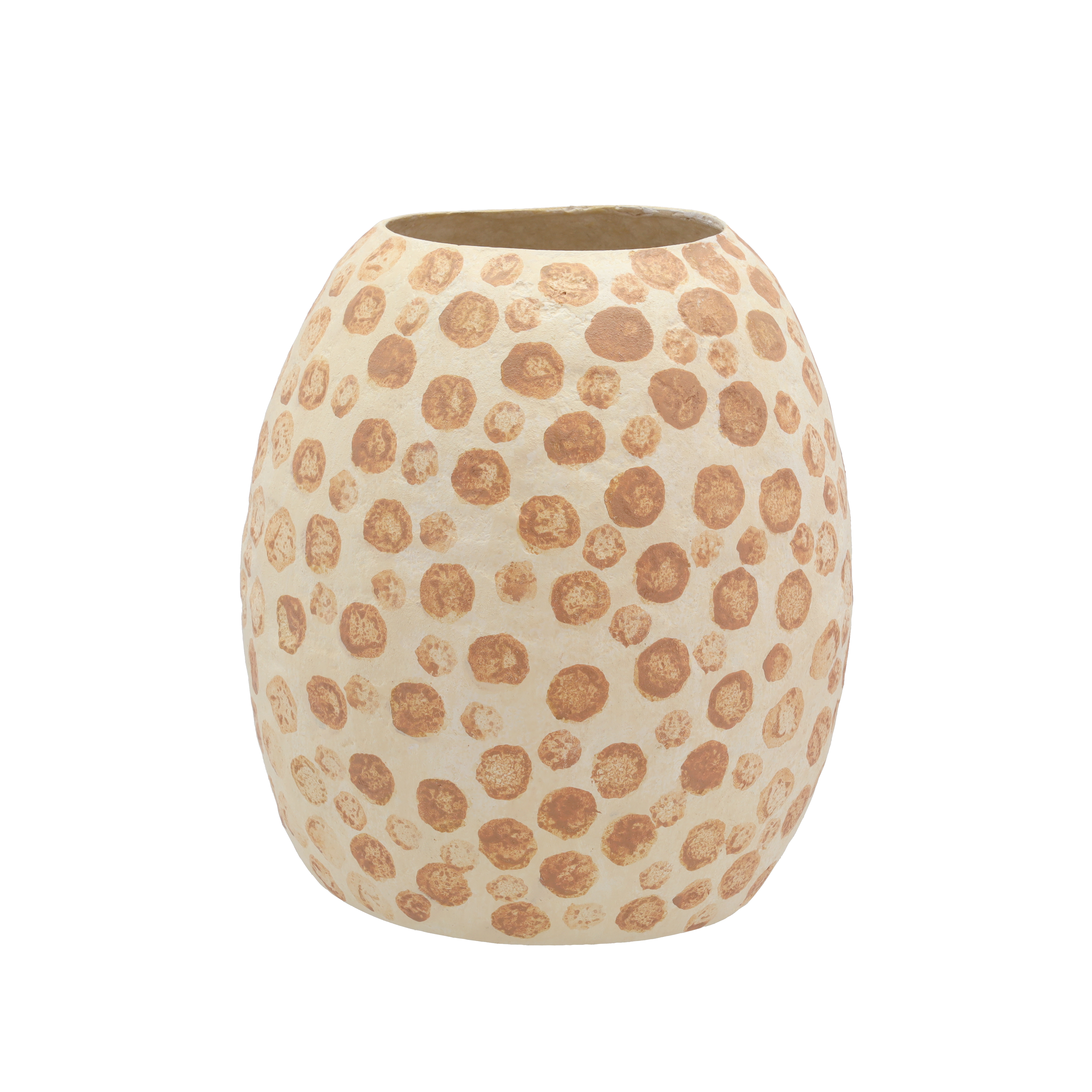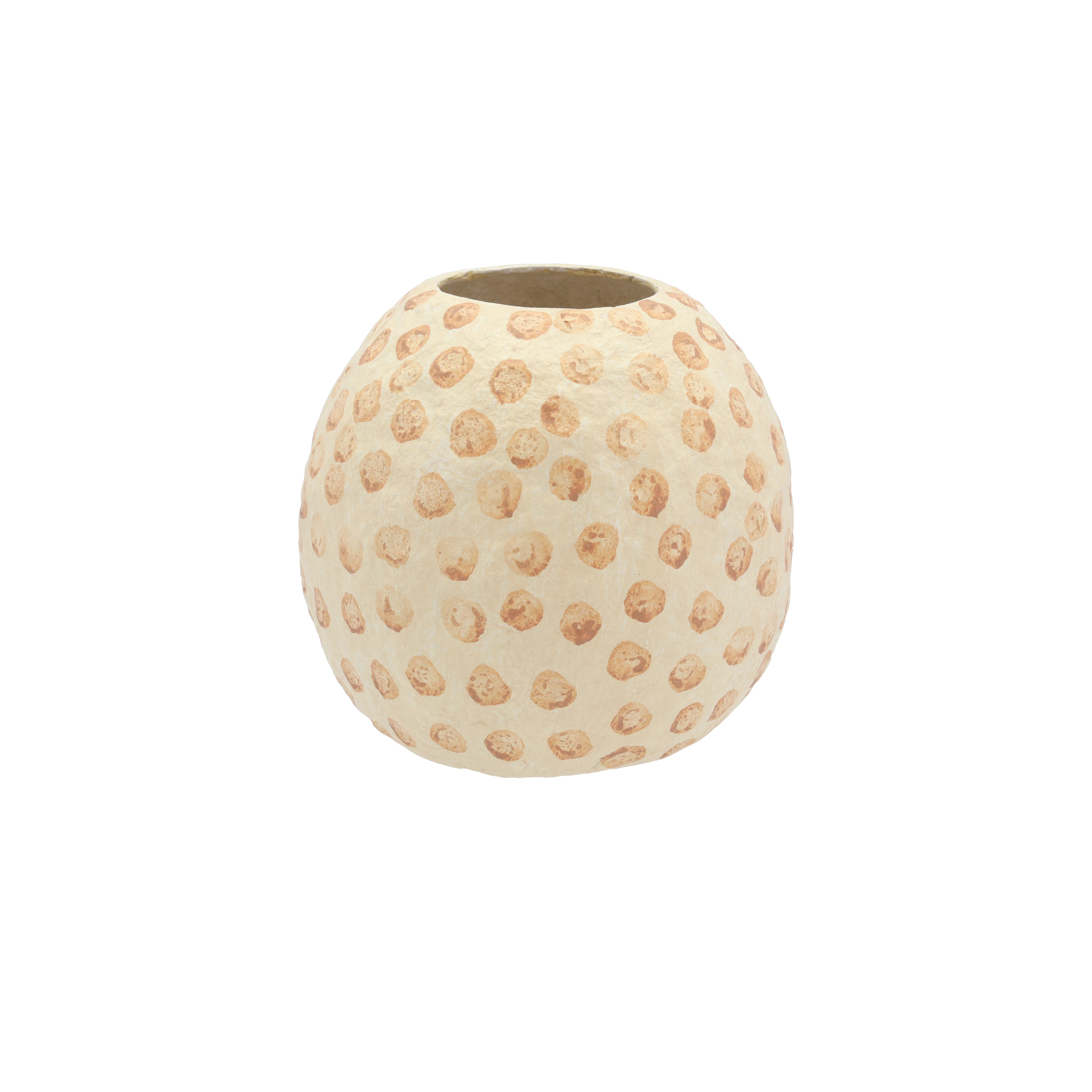 Flot dekorationsvase i cremefarvet papmaché med nougatfarvede prikker, 28,5 cm høj. Den skønne vase er lavet i en form og færdiggjort i hånden, bundfarven er sprayet på, og prikkerne er efterfølgende håndmalet. Vasen har derefter fået en forsegling.
