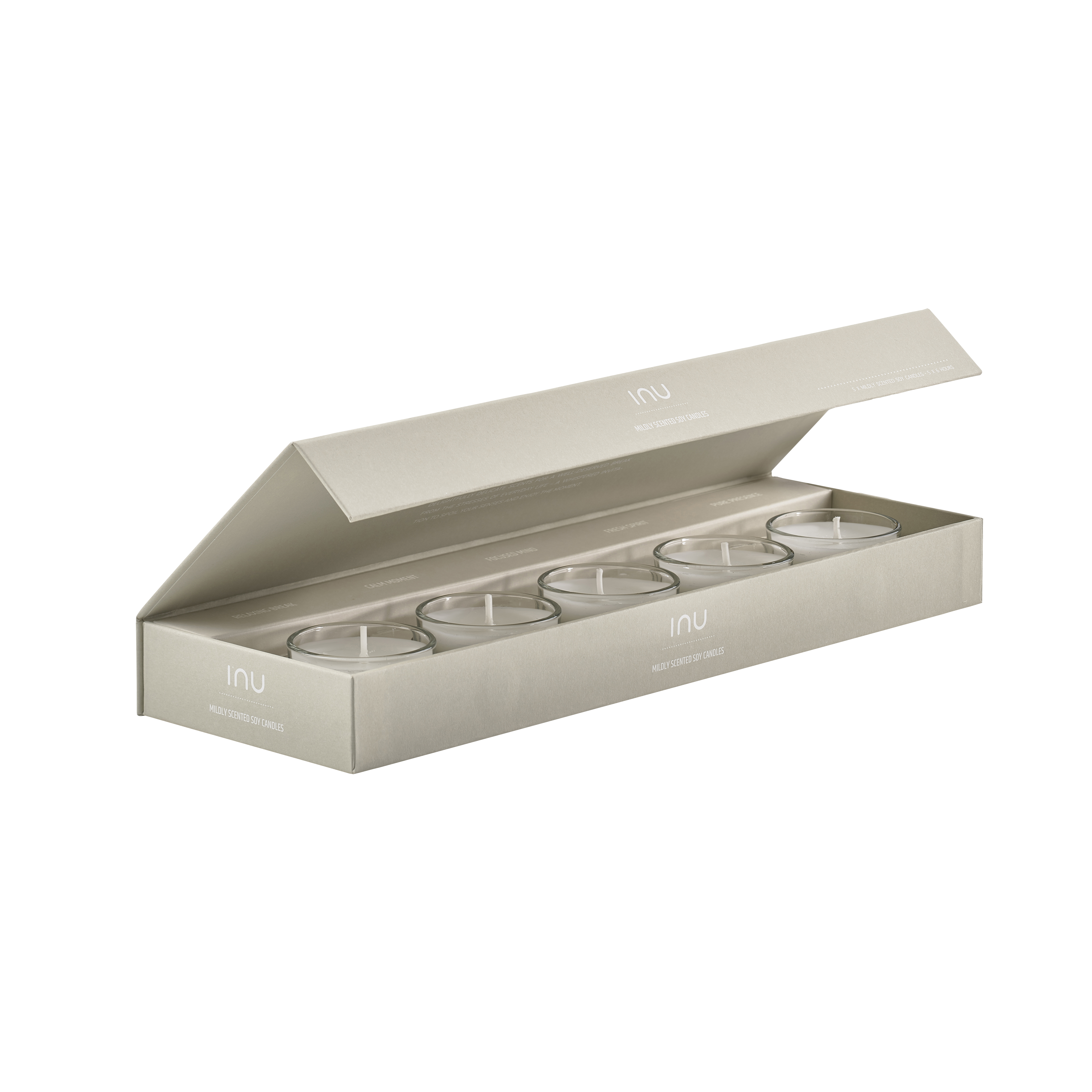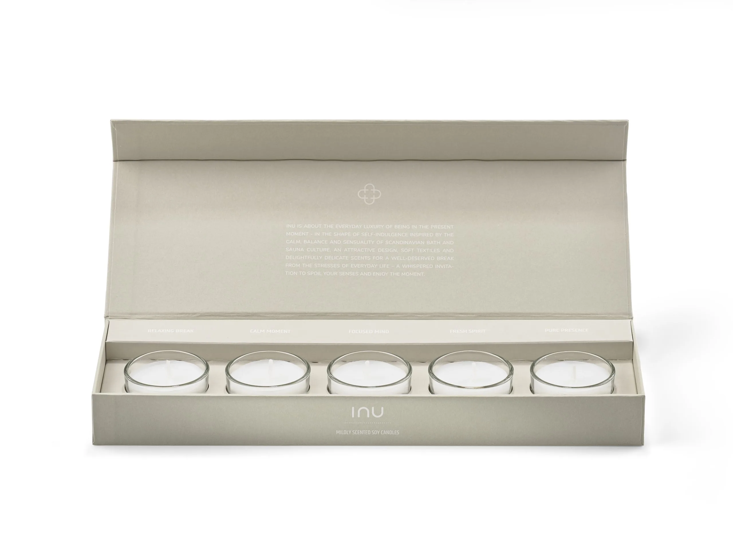 5 Duftlys med duftene Calm Moment, Pure Presence, Fresh Spirit, Relaxing Break og Focused Mind. 6 timers brændetid. Højde 2,3 cm, dia. 4,5 cm.