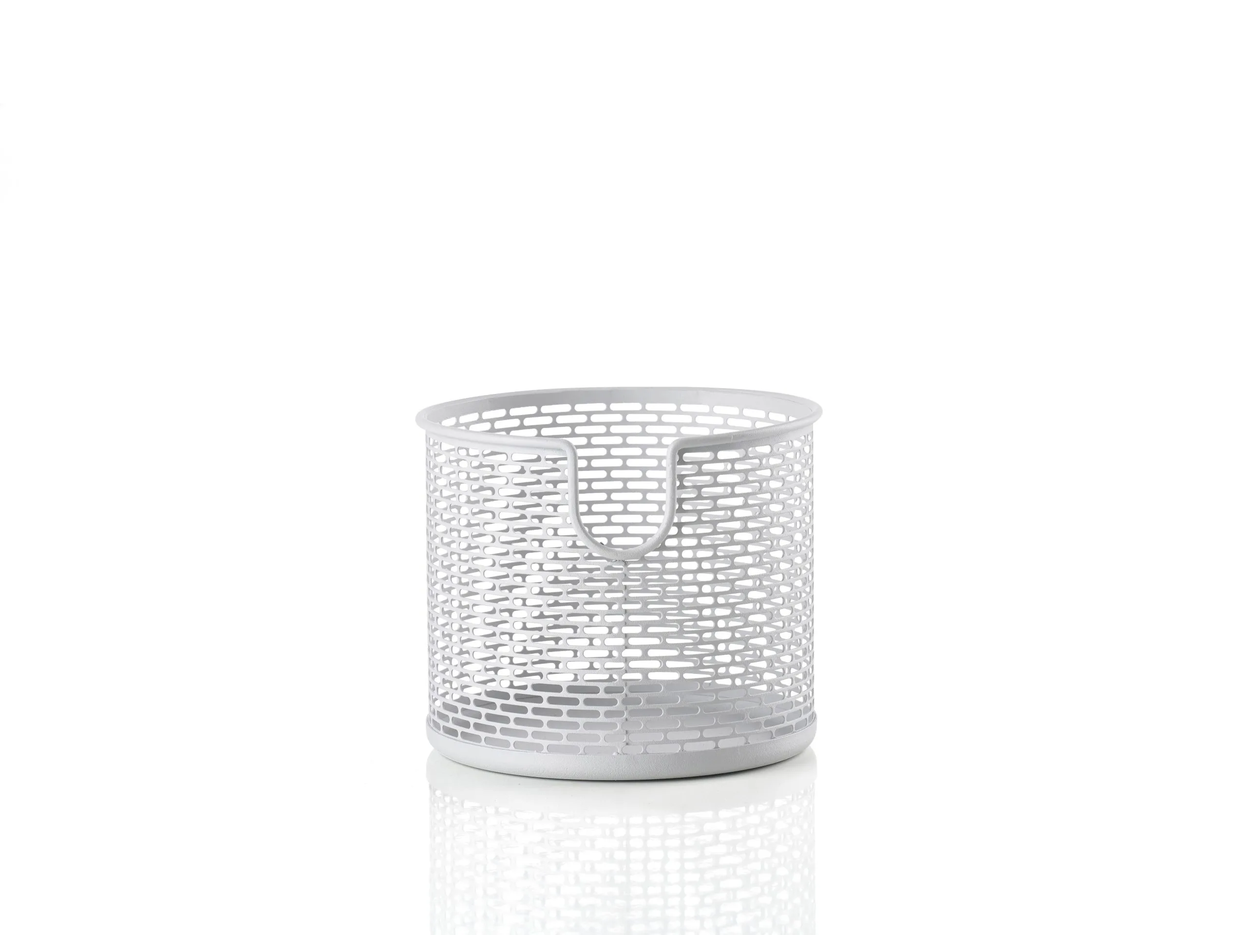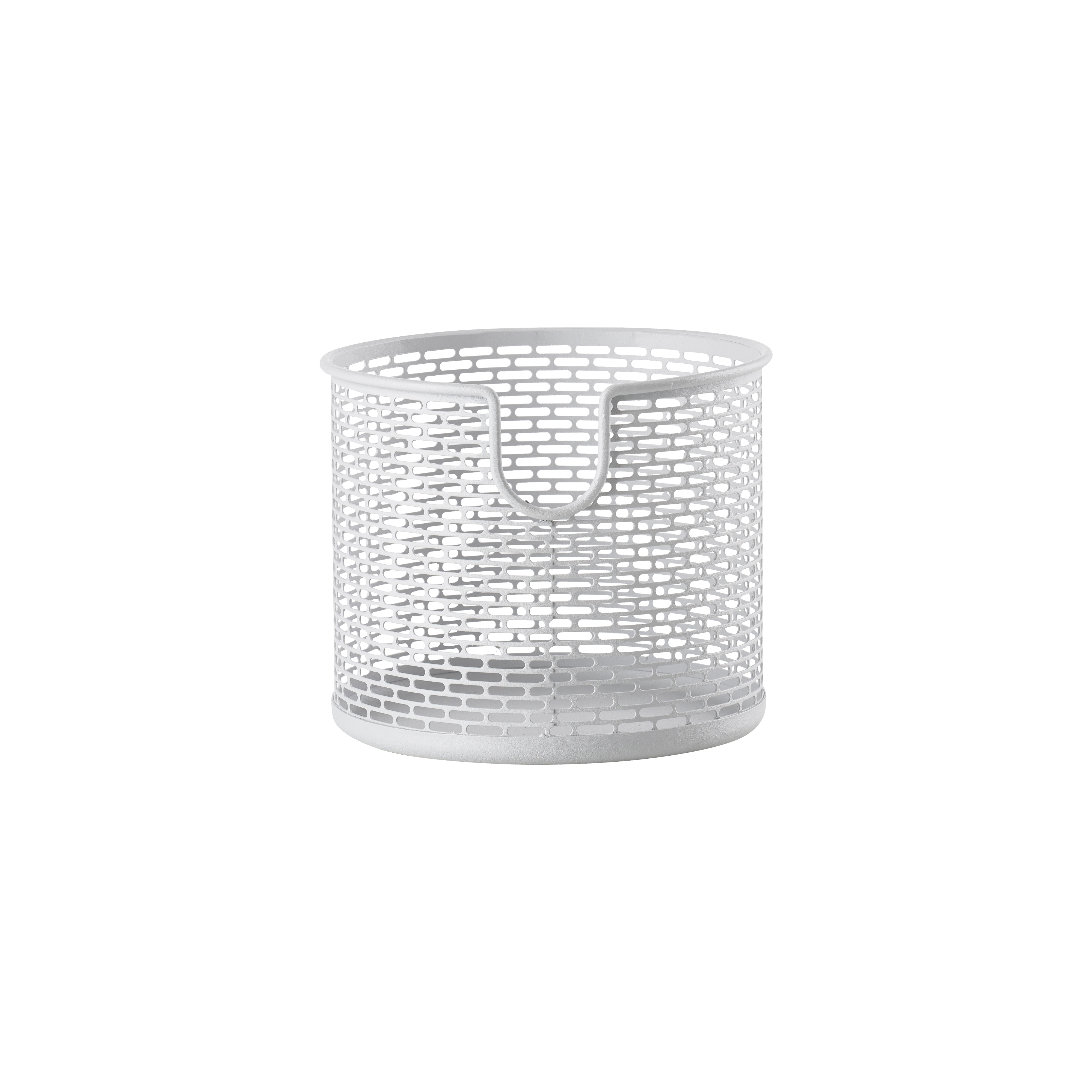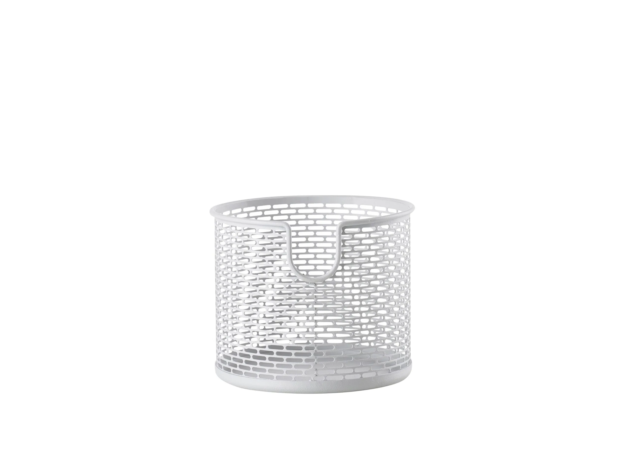 Lækker metalkurv til bordet eller hylden. Sæt skik på makeup, vatrondeller, cremer eller hårpynt. Kurvens design opbløder det maskuline metal med feminine buer og udskæringer, der gør den dekorativ både med og uden indhold. Diam. 12 cm, højde 10 cm.