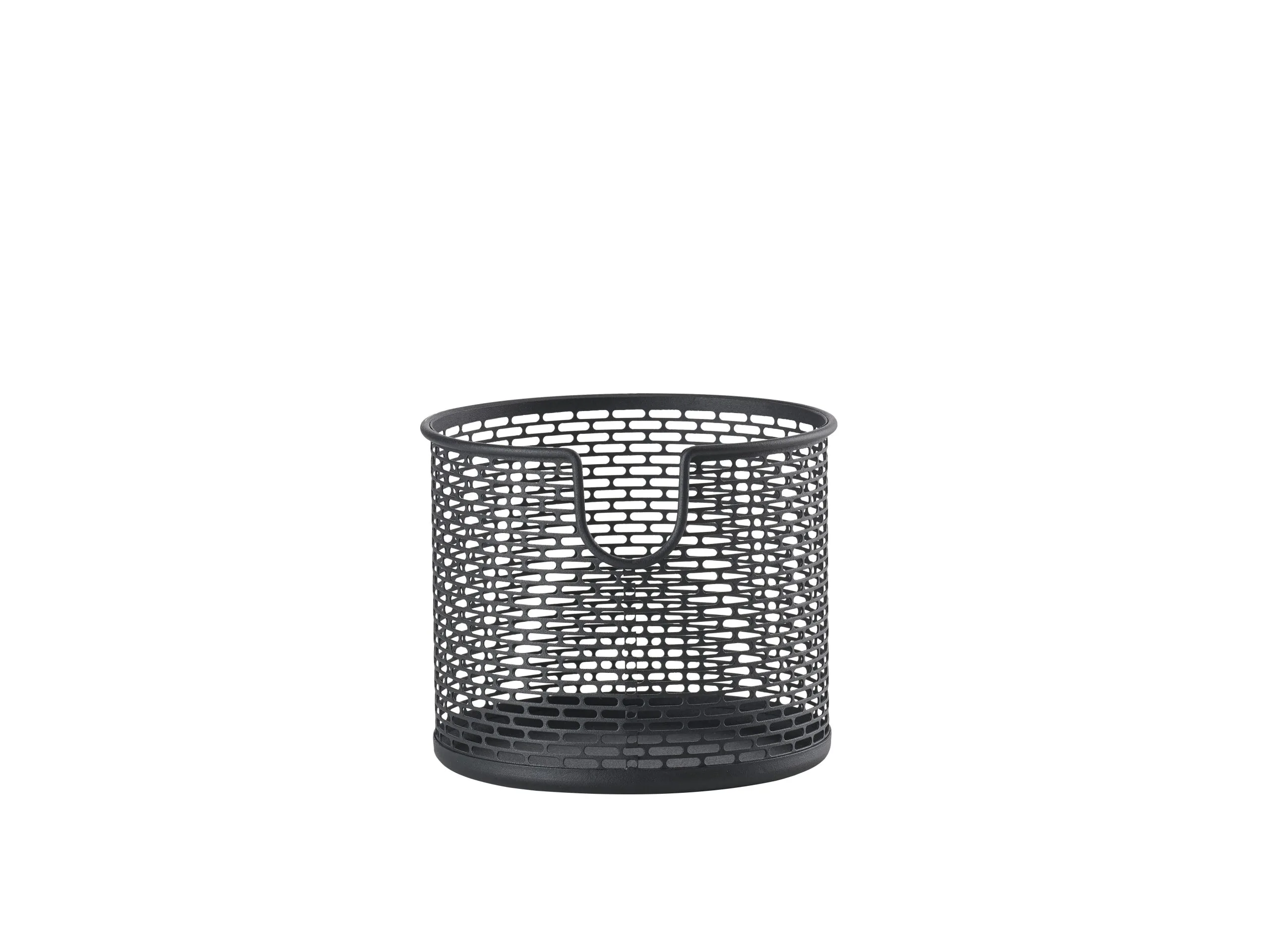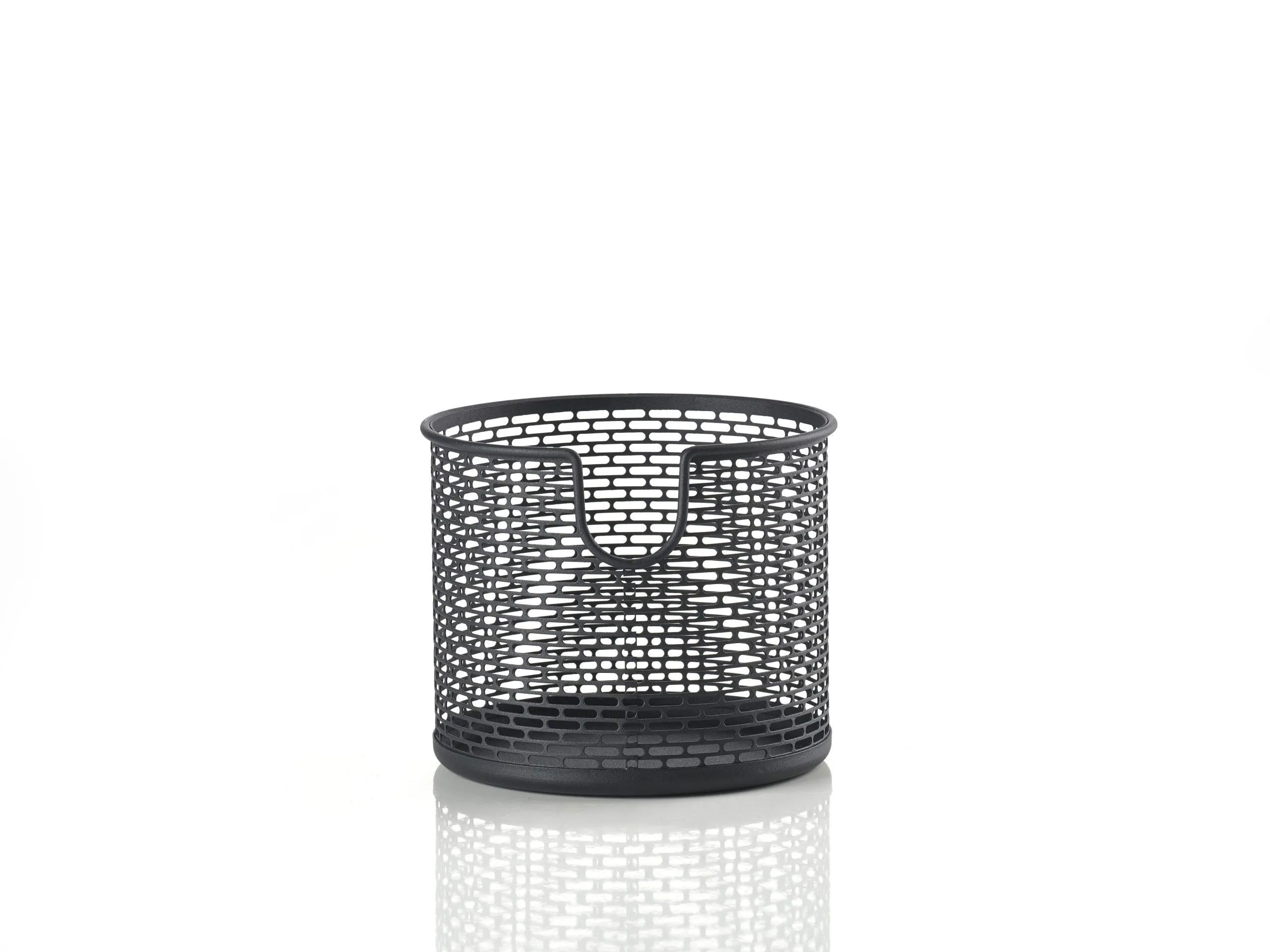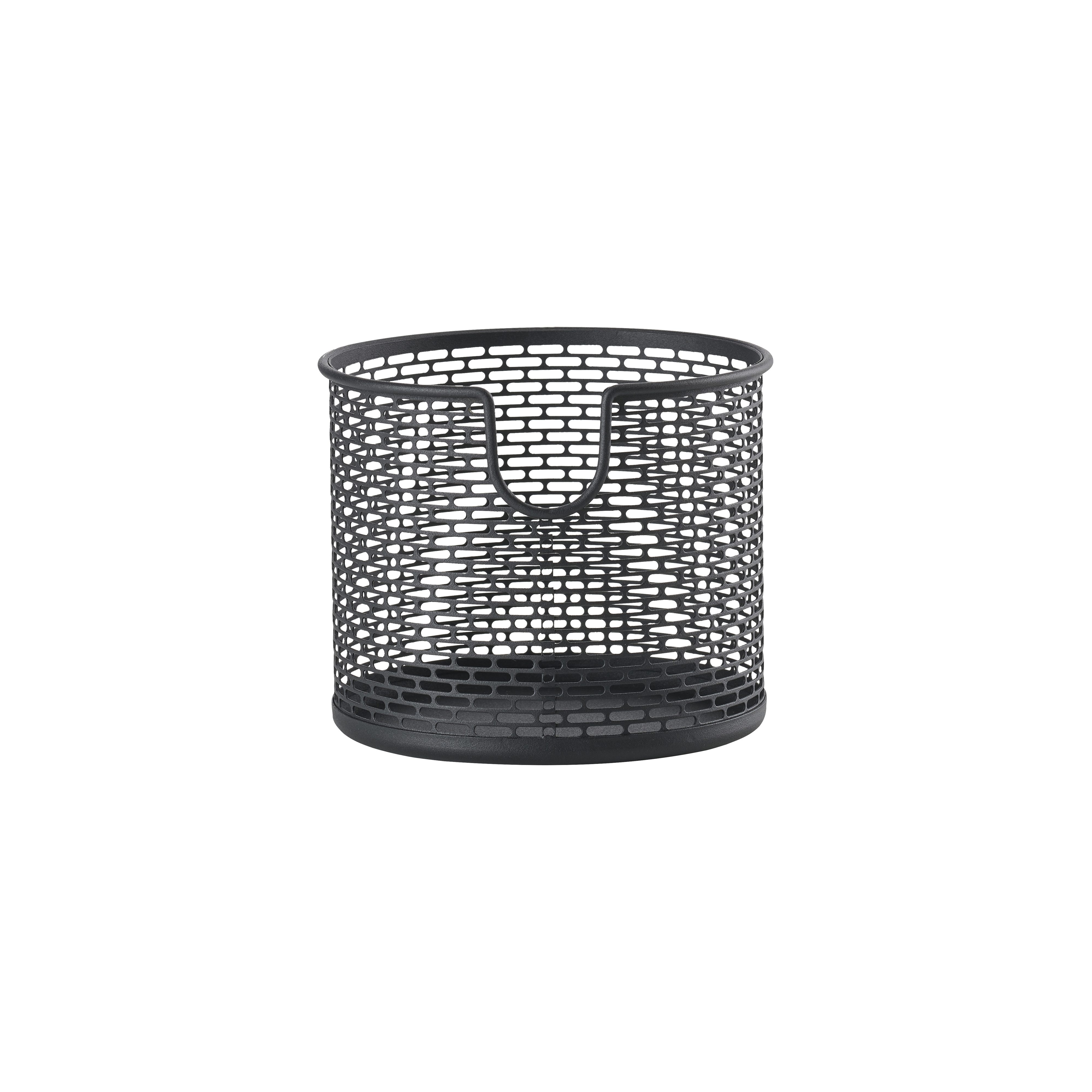 Lækker metalkurv til bordet eller hylden. Sæt skik på makeup, vatrondeller, cremer eller hårpynt. Kurvens design opbløder det maskuline metal med feminine buer og udskæringer, der gør den dekorativ både med og uden indhold. Diam. 12 cm, højde 10 cm.